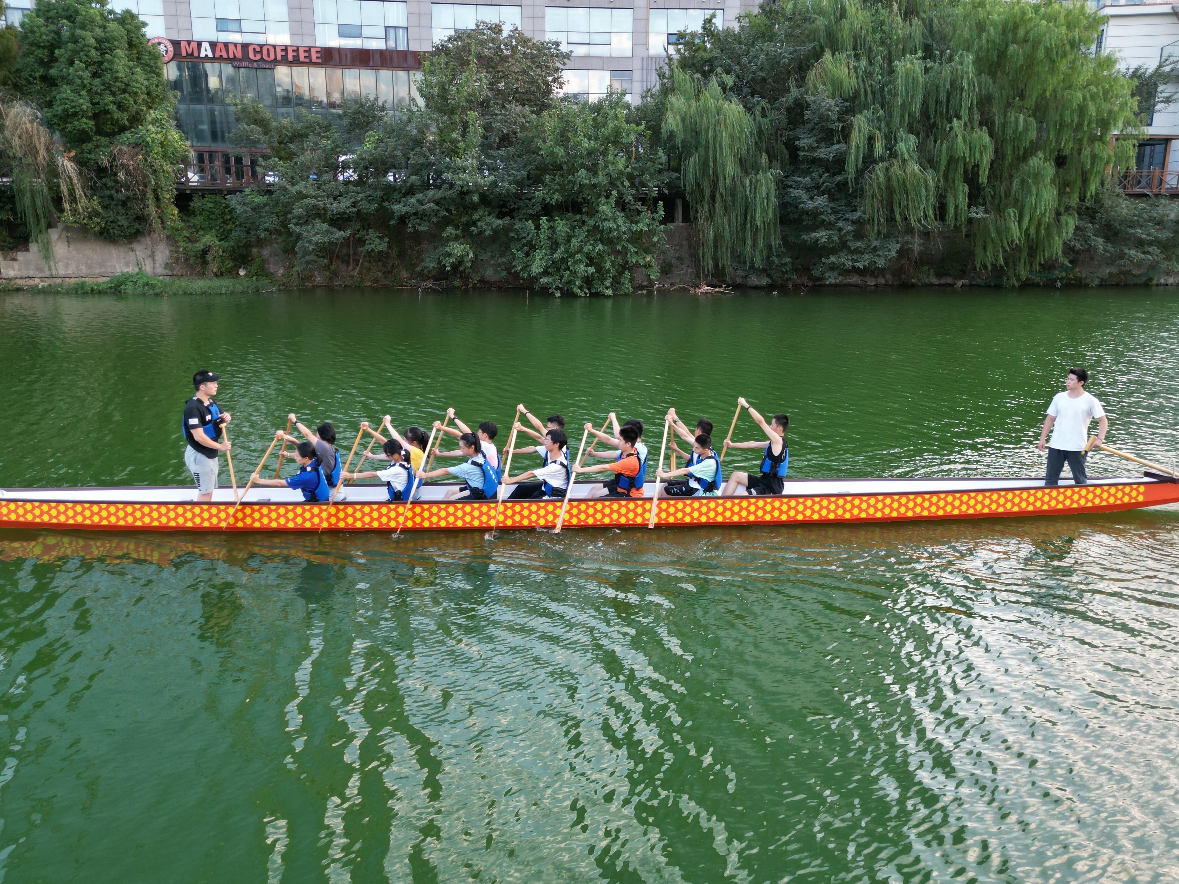 “纸上得来终觉浅,绝知此“手跟不上脑子”事要躬行。”尽管学习了理论知识,多数同学实操起来还是有些不太熟练。“桨要齐”、“桨插满”、“紧跟前面同学的节奏”……在龙舟队员的不断指正和同学们的不懈努力下,尽管手酸腿软,尽管筋疲力尽,这两支新手龙舟小队总算是划得有些模样了,同学们也感受到了中华传统体育文化的魅力。