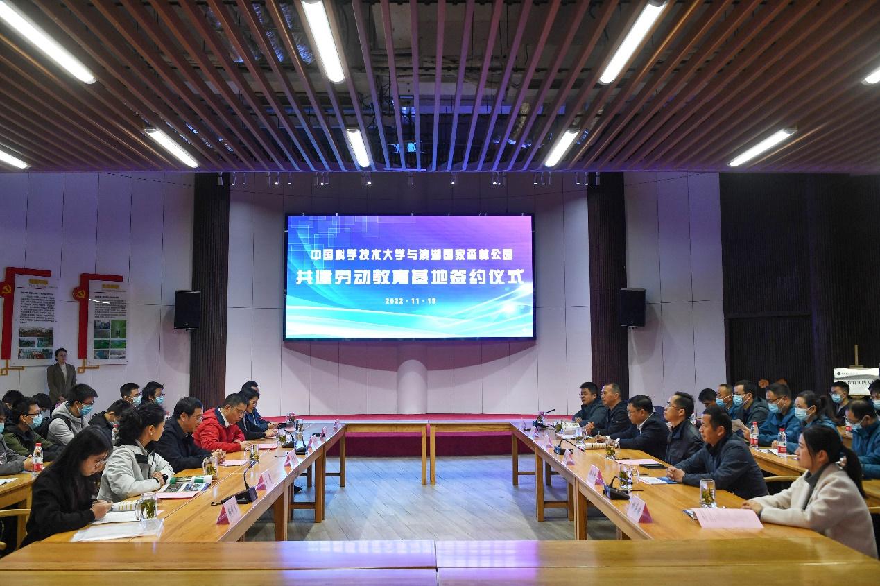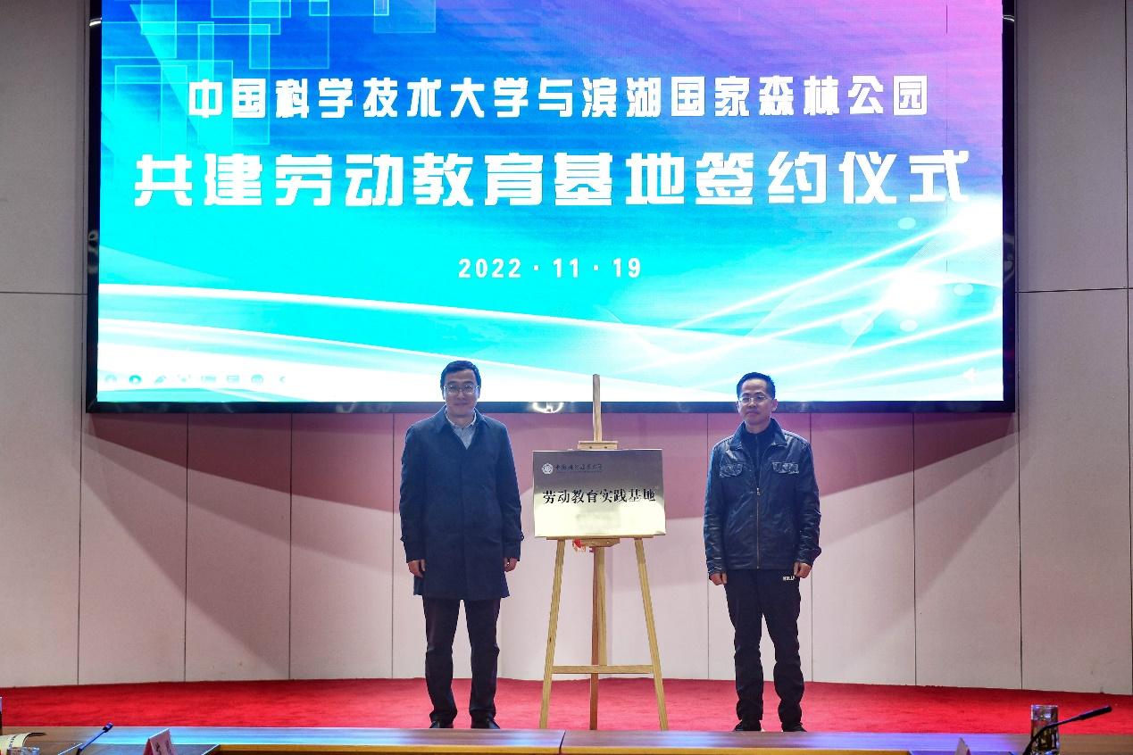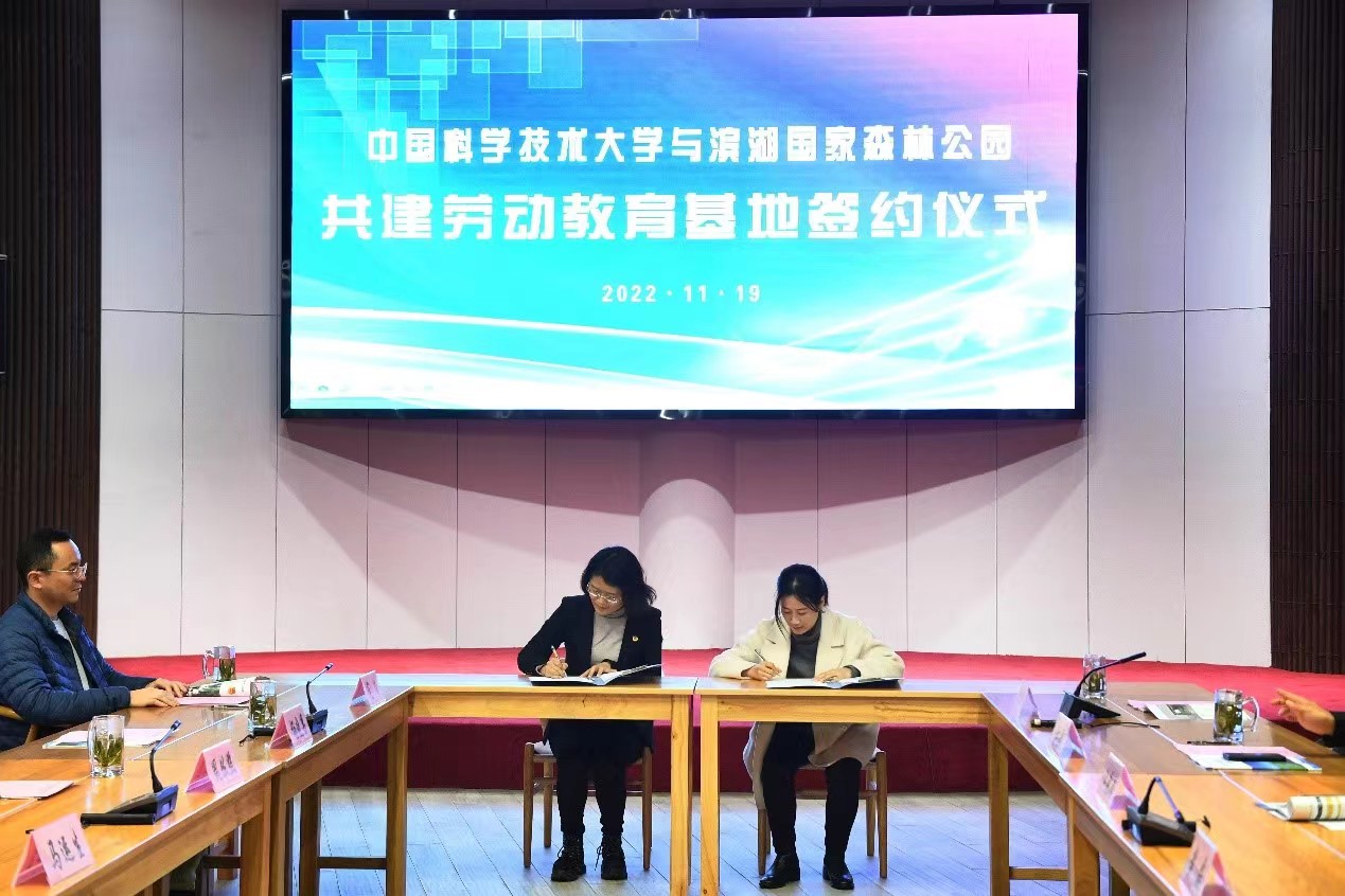 1 1月1 9日上午,我校与合肥滨湖国家森林公园共建劳动教育基地签约仪式在森林公园有巢游客接待中心顺利举办。中国科学技术大学党委常委、副校长周丛照,包河区人民政府副区长、党组成员江晓春,教育体育局党委书记、局长李磊,合肥印象滨湖旅游投资发展有限公司党委书记、董事长、总经理方彪,党委委员、副总经理谢波、钱元胜,正原研体文化公司总经理胡庆姝,我校基础教育集团党委书记、主任马运生,团委书记杨晓果,本科生院办公室副主任王童等出席了本次活动。