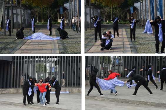 《亚克力是什么》由我校李勃锐(化学与材料科学学院)、李颜菽(人文与社会科学学院)、金忆南(生命科学学院)、曾亦铭(计算机科学与技术系)等4名学生参与表演,指导老师为安徽大学艺术学院戏剧系副主任陈蓓蕾。这是一个用音乐和身体表现的戏剧作品。作品以布条为道具,代表当代社会中隐藏在人们行为背后的“潜规则”。在规则的约束下,人们逐渐同一。然而随着新生人群的步入,原有的规则不断被挑战,新生人群愈发想要冲破规则甚至改变规则,被规则束缚住的人们便愈发想要同化新生人群,变得疯狂、扭曲……