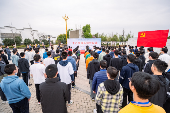 全体年满十八岁的同学举起右手,庄严宣誓:天地为鉴,国旗为证,十八而誓,自律自强。作为中华人民共和国公民,我将:爱国爱党,奉献社会。感恩父母,善待友邻。崇尚真理,奋发有为。完善自我,追求卓越。以我壮志激情,建设幸福家园。以我热血青春,创造美好明天。