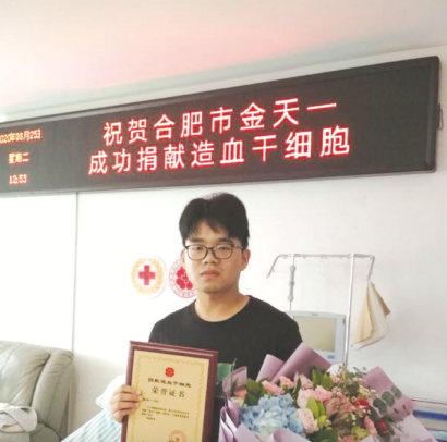 2020年6月的一天,金天一接到合肥市红十字会的电话,得知自己和一位白血病患者配型成功。在合肥市红十字会工作人员陪同下,金天一顺利完成了相关体检,并在8月底住院为抽取造血干细胞作相应准备。当年8月25日,金天一在科大附一院成功捐献造血干细胞,北京一位急性淋巴细胞白血病患者因此获得了手术治愈的机会。采集的过程持续了约一个上午三四个小时,最终完成了约300毫升的采集,完成后直接送到了这位北京患者的身边。金天一说:“配型成功不容易,顺利完成捐献采集,就是我能够给予患者最大的帮助!”
