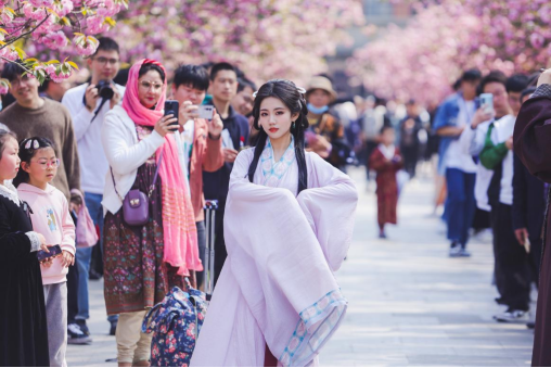 背景音乐变化到《江上清风游》,樱花大道上身着魏晋南北朝时期服装的同学充分展示了自然洒脱、清秀空疏的气质,让在场的同学们感受到魏晋南北朝时期各民族的相互影响、相互吸收、渐趋融合的特点。