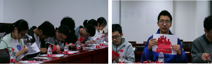 鲍老师提前为本次讲座准备好剪刀和红纸,现场手把手进行教学,讲授了窗花、狼牙山五壮士图等素材的剪纸手法,在场师生积极参与,动手实践,大家都完成了十分精美的剪纸作品。讲座上,鲍老师还与大家分享以红色文化为主题创作的其他剪纸作品。
