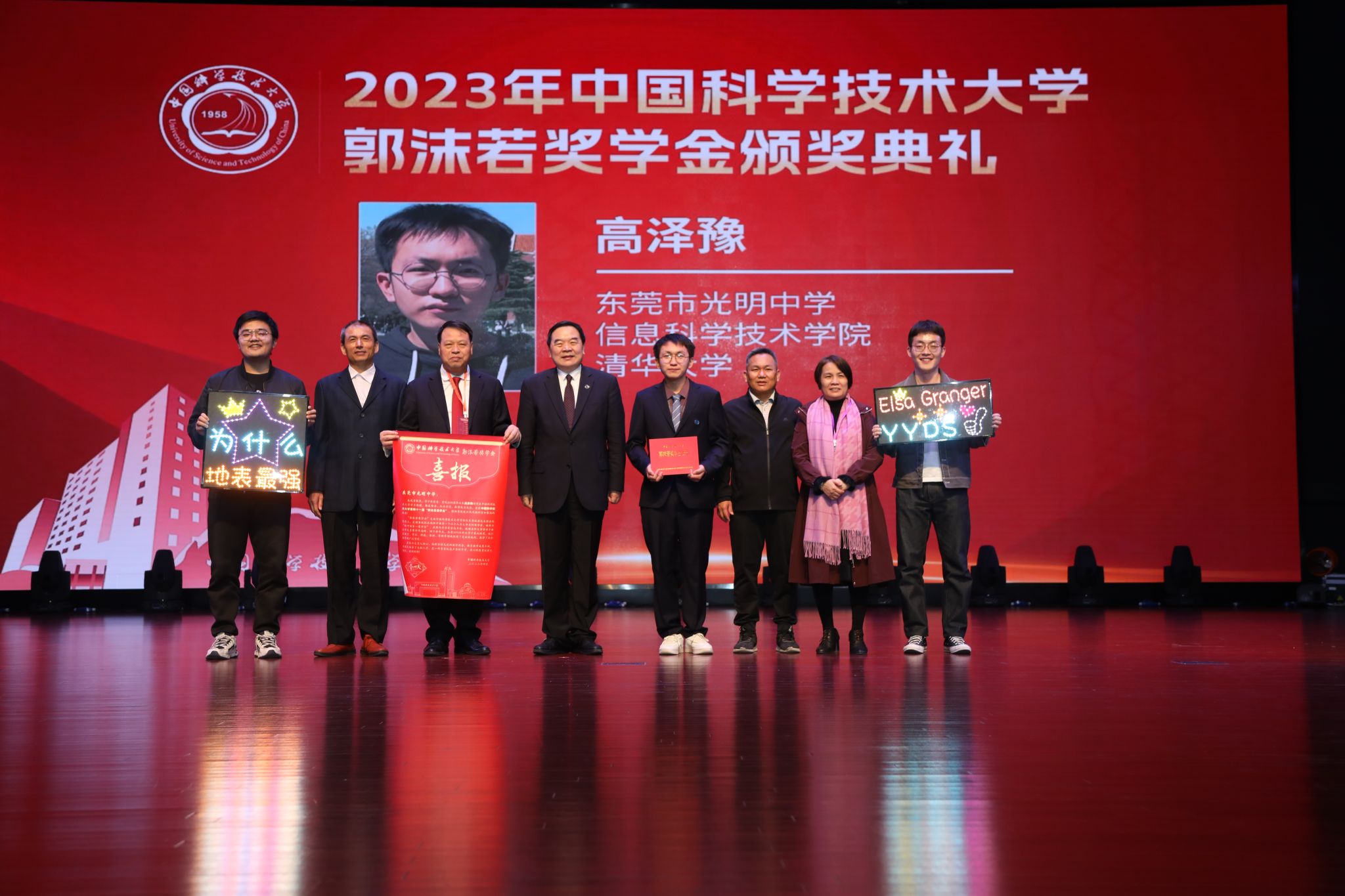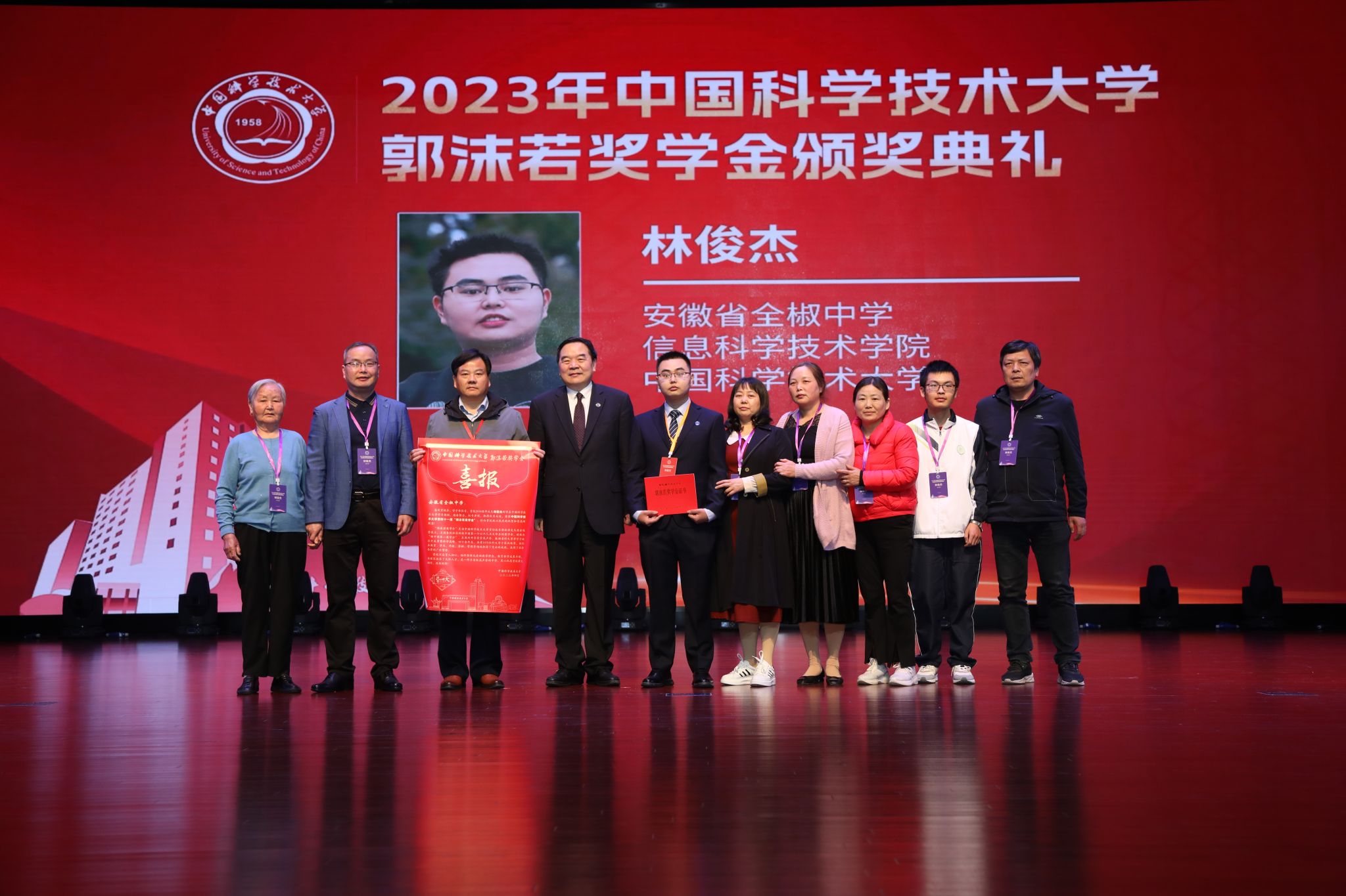 在颁奖环节,包信和校长首先为郭沫若奖学金获奖学生逐一颁发获奖证书,为获奖学生中学校长颁赠“喜报”,并与获奖学生及其家长、老师代表一同合影留念。