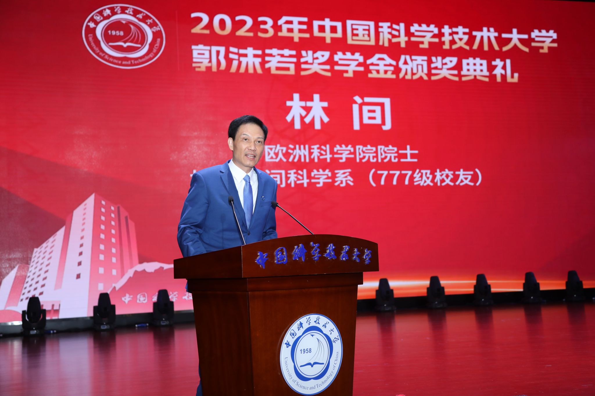 林间在致辞中表示,四十二年前,学校举行首届郭沫若奖学金颁奖仪式,自己有幸作为获奖者之一登台领奖,四十二年后,回到母校再次参加颁奖典礼,感到十分荣幸。林间向获奖同学提出两点建议:一是感恩母校、回馈社会。同学们取得的成就离不开母校、老师、家长以及同学的支持,要时刻保持谦逊、善良的初心,做“又红又专”的科大人。二是面对逆境、不屈不挠。人生道路很长,未来遇到任何困难,要迎难而上、永不放弃。希望同学们坚定信心,勇敢追求卓越,成为国家栋梁。