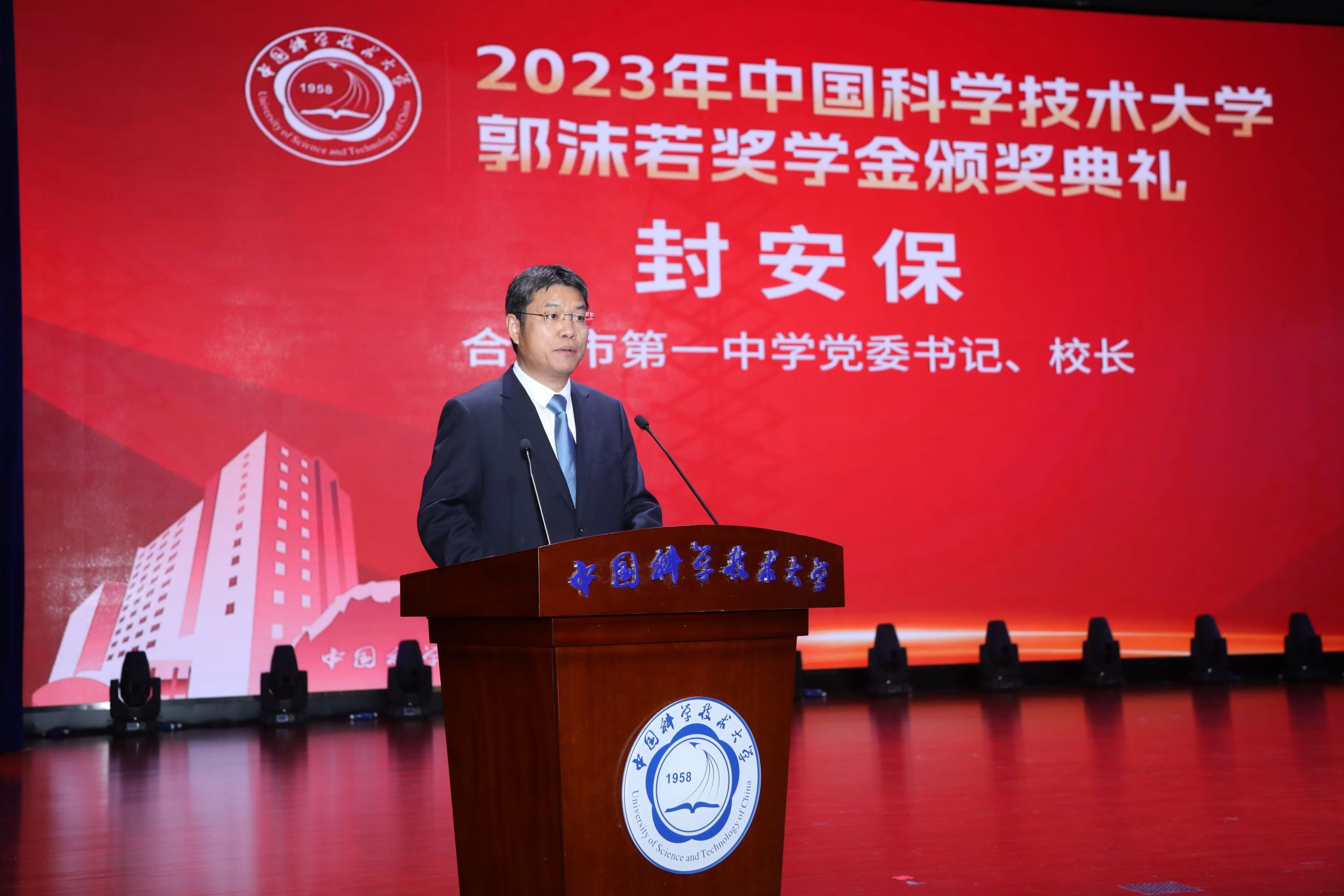 封安保在致辞中说,中国科大是教育改革的先行者,与合肥一中等全国知名高中建立了长期稳定的深厚友谊,在中学与大学之间架起了一条创新型人才培养的坚实桥梁。郭沫若奖学金作为新中国第一奖学金,是中国科大金光闪闪的名片,是每一位科大学子梦寐以求的最高荣誉。“韬略终须建新国,奋发还得读良书”,这是郭沫若先生对青年人的勉励,“郭奖”既是荣誉,更是责任,希望各位同学砥砺奋进,不负韶华,成为中华民族伟大复兴事业的国之栋梁。