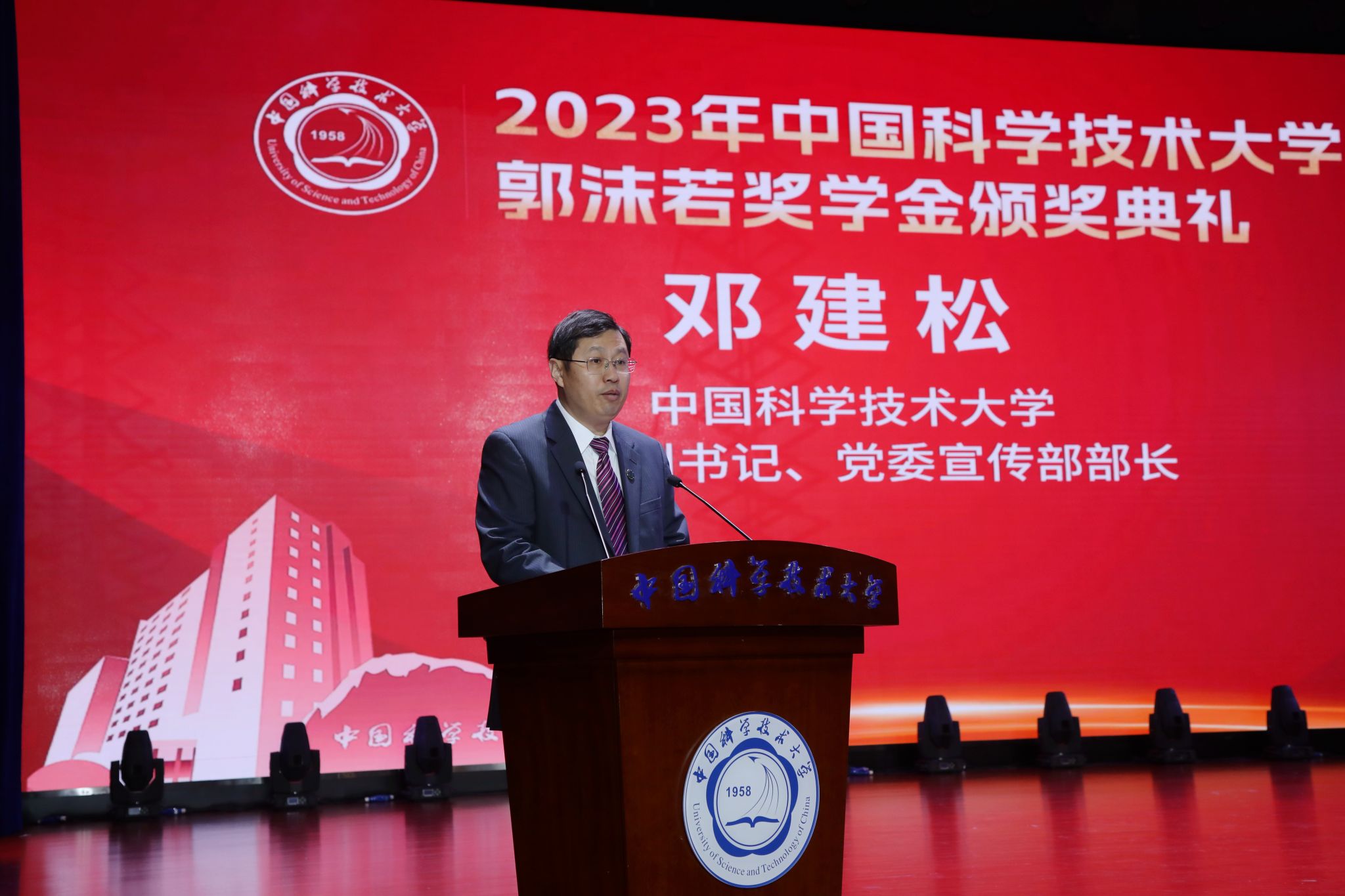 包信和校长首先向荣获第41届、42届郭沫若奖学金的65位同学表示热烈的祝贺,向远道而来的各位家长、各位中学校长和老师表示诚挚的欢迎。他以我校81级少年班校友、第五届郭奖获得者、美国国家科学院院士骆利群,以及85级校友、第九届郭奖获得者、中国科学院院士王赤为例,讲述了他们面向世界科技前沿、瞄准国家战略需求,自强不息、砥砺奋进,在各自领域取得巨大成就的事例,勉励同学们今后无论身在何处,都永远秉持科大人“科教报国、追求卓越”的初心使命,砥砺奋进、再创辉煌。