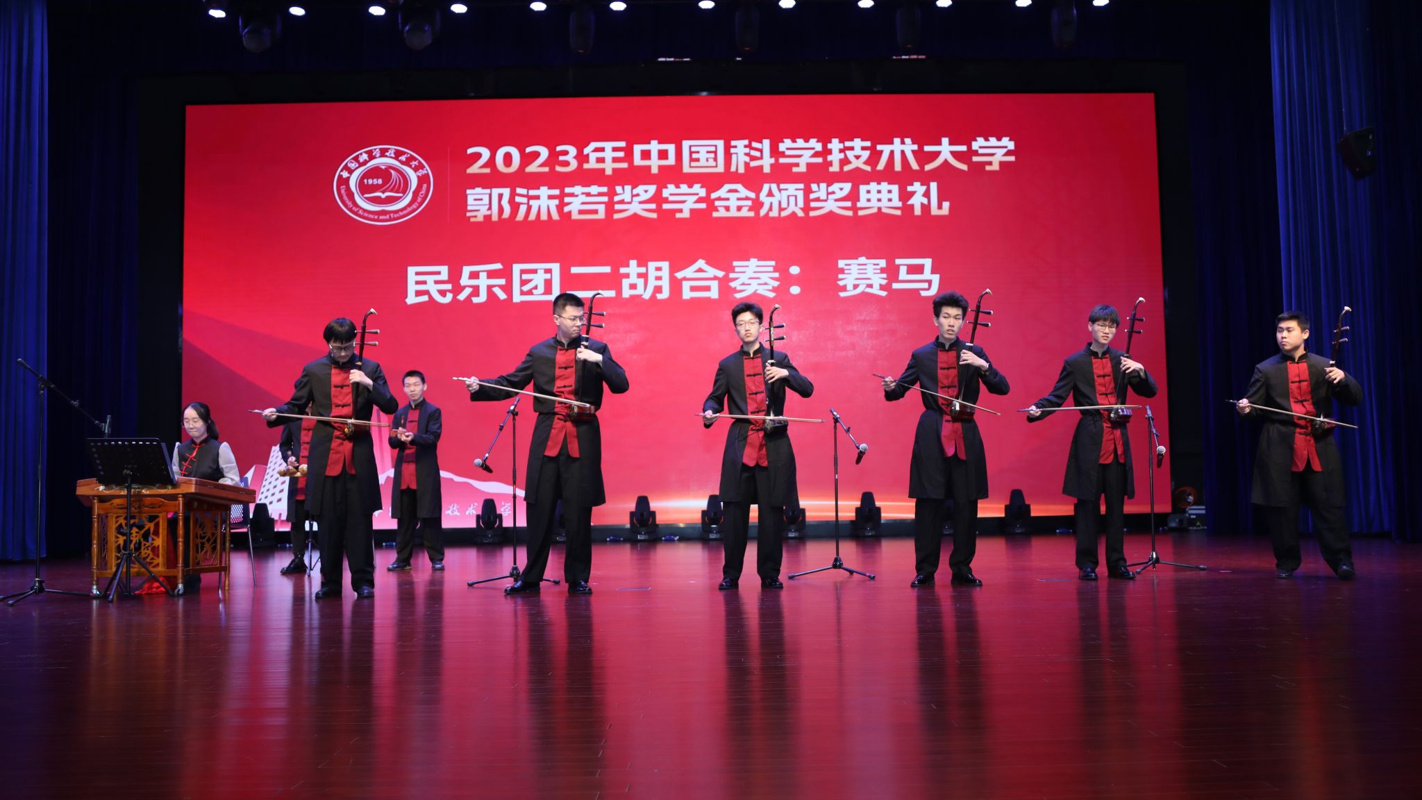 颁奖仪式上,校学生民乐团同学带来的二胡合奏《赛马》,将颁奖典礼气氛推向高潮。