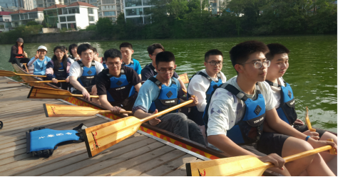 在岸上热身运动结束后,指导老师们严格检查确认了同学们救生衣穿着方式无误,组织同学们开展了龙舟文化实践。龙舟是一项水上体育竞技运动,在下水前老师们反复强调了划龙舟的注意事项和竞技要领,要求同学们听从指挥、服从安排,确保船体平衡。在校龙舟队专业队员的指导下,同学们从基础的握桨和划桨动作要领学起,“桨插满”“视线注意前方与旁边同学划桨的频率”“手拉直,主要用腰部力量”和“插桨!划!插桨!划!……”,经过多次练习后,大家基本掌握了划船的节奏控制和发力方式。同学们进行了两公里的龙舟体验,划的过程中心往一处想、劲往一处使,深刻感受到了龙舟作为中华传统体育活动所蕴含的“同舟共济”的魅力。
