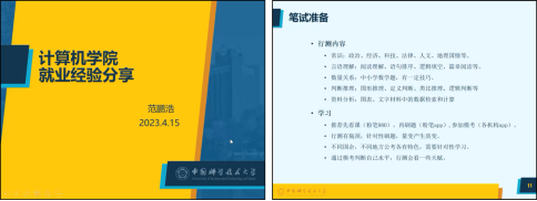 知识与数据工程实验室的范鹏浩学长侧重国企和选调的方面的经验分享,囊括自身在多类国企和近10省选调的求职历程。范学长细致地介绍了如何选择、求职适合的国企以及如何准备选调前的材料、笔试和面试。学长建议同学们求职中要大胆尝试,慎重选择,放平心态面对考核。
