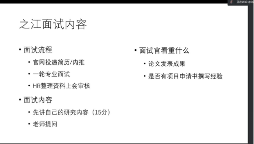 凃化清分享了自己的求职经历。由于她即将博士毕业,因此求职方向非常明确,依据自身的研究方向来选择比较匹配的工作来参加面试,并成功获得华为和之江实验室的相关职位。这两个工作都是和自身科研经历、项目经历紧密相关。凃化清着重强调了博士求职中对方看重的自身学术能力、项目申报能力等方面能力。