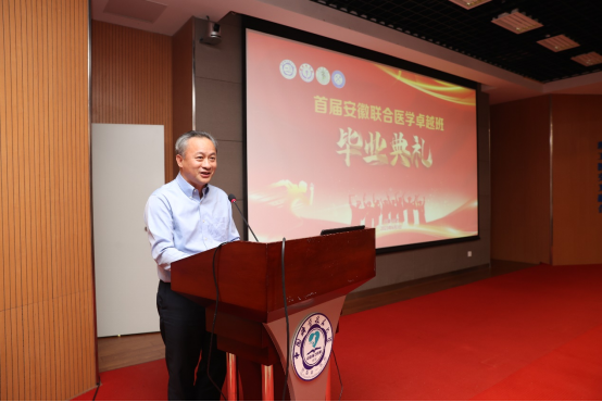 卞修武院士提到,两年前在中国科大附属第一医院见证了首届安徽联合医学卓越班学子的开班。两年时间同学们以优异的成绩完成了学业,展现了同学们敢于超越、奋勇争先的风采和精神面貌。并指出,中国科大自2017年建设新医学以来,一直以培养医生科学家为目标,安徽联合医学卓越班就是医学教育创新发展的新样板之一,与兄弟医学院校一起统筹规划,做好培养方案、课程体系建设和师资队伍保障等各项工作。希望未来能够有更多优秀人才加入到安徽联合医学卓越班中来。