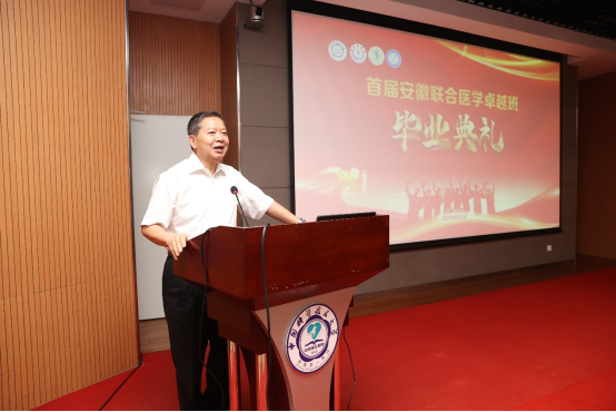 钱桂仑书记首先代表省教育工委、省教育厅祝贺同学们圆满完成学业,开启人生新篇章。他表示医疗卫生事业事关人民健康,事关社会稳定,事关国家安全。举办安徽联合医学卓越班是落实党中央、国务院决策部署的重要举措,也是落实立德树人根本任务的重要载体,更是落实加快医学教育创新发展实施方案的具体行动。希望同学们脚踏实地,立足祖国大地,在实干苦干中履践致远。省委教育工委、省教育厅将继续高度关注、大力支持安徽联合医学卓越班的举办。