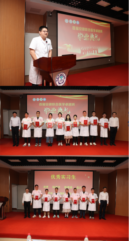 毕业典礼上,卞修武院士、严光院长为首届安徽联合医学卓越班毕业生颁发第二校园学习证书。姚应水院长,姚文兵副书记为凌霄、陈博语、孟江、蔡叶、汪颖琛、许金亮、陆泽宇7位同学颁发优秀实习生证书。