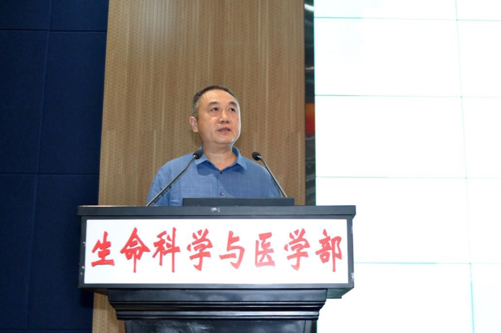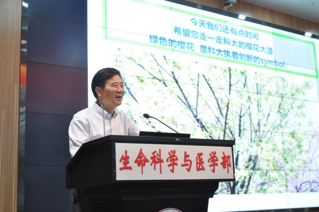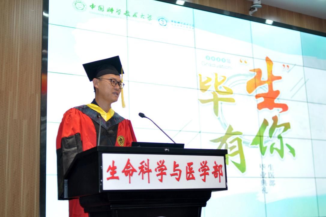 生医部党委常务副书记魏海明教授发表致辞,他首先表达了对毕业同学的不舍,希望同学们珍惜在校的这段时光,走一走星光大道,看一看老一辈科学家,永怀初心,实践科大人报效国家的精神;走一走樱花大道、看一看也西湖,再一次欣赏校园风光。最后期待同学们继续奋斗,不负时代,不负韶华!