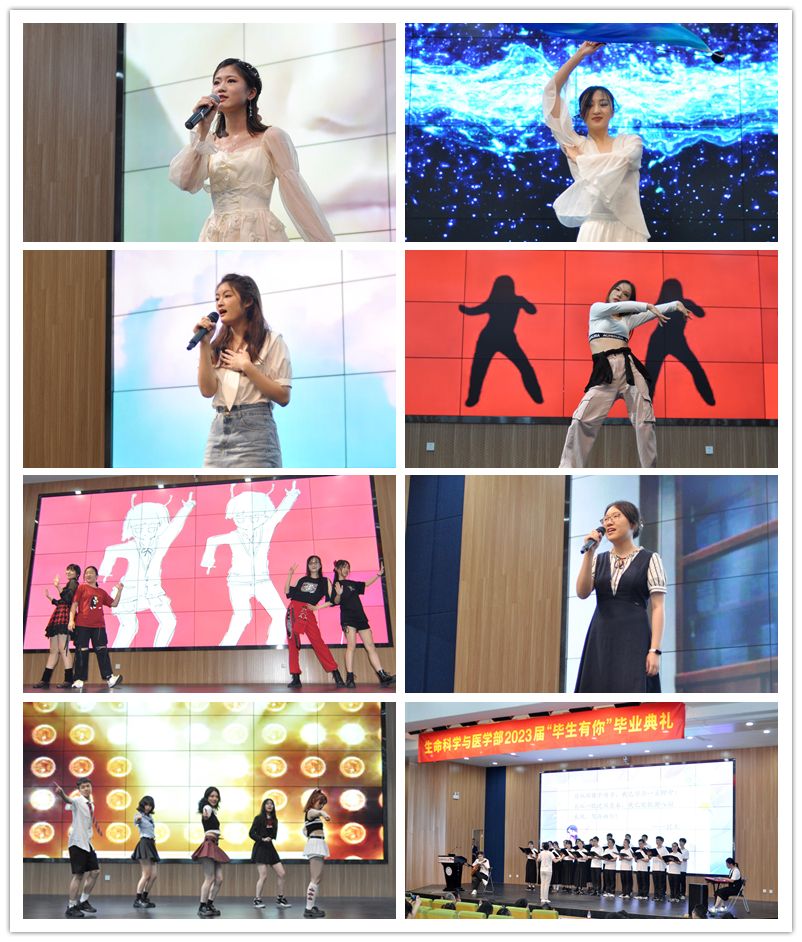 毕业典礼第二部分,由生医部毕业生和其他年级同学们为母校老师和同学们献上了一场文艺盛宴。毕业晚会分为“告别温柔的岁月”“拾取沸腾的青春”“向着晴朗的未来”三个篇章,由王晨蕾同学的独唱《小幸运》拉开了整场文艺表演的序幕。随后,陈洁琼同学的舞蹈《云与海》演绎了如云般飘逸灵动、如海般变幻莫测的青葱岁月;李丽雅同学带来的歌曲《遇见》情深意重;王倩同学的舞蹈《kill the love》青春洋溢;四名2019级本科毕业生的舞蹈《太阳系disco》则展示了00后学生的可爱与无畏。由费雨萱同学带来的独唱《一期一会》,让同学们重拾了军训场上、中秋晚会、南京团建的一幕幕回忆;接着五位研究生带来的舞蹈《初智齿》把全场气氛推向高潮。2019级本科生班的压轴合唱节目《亲爱的旅人》,悠扬的木吉他,轻灵的键盘声,优美的和声,配上幕布上展示的同学们的毕业留言,一种不舍的情绪瞬间在胸腔满盈。