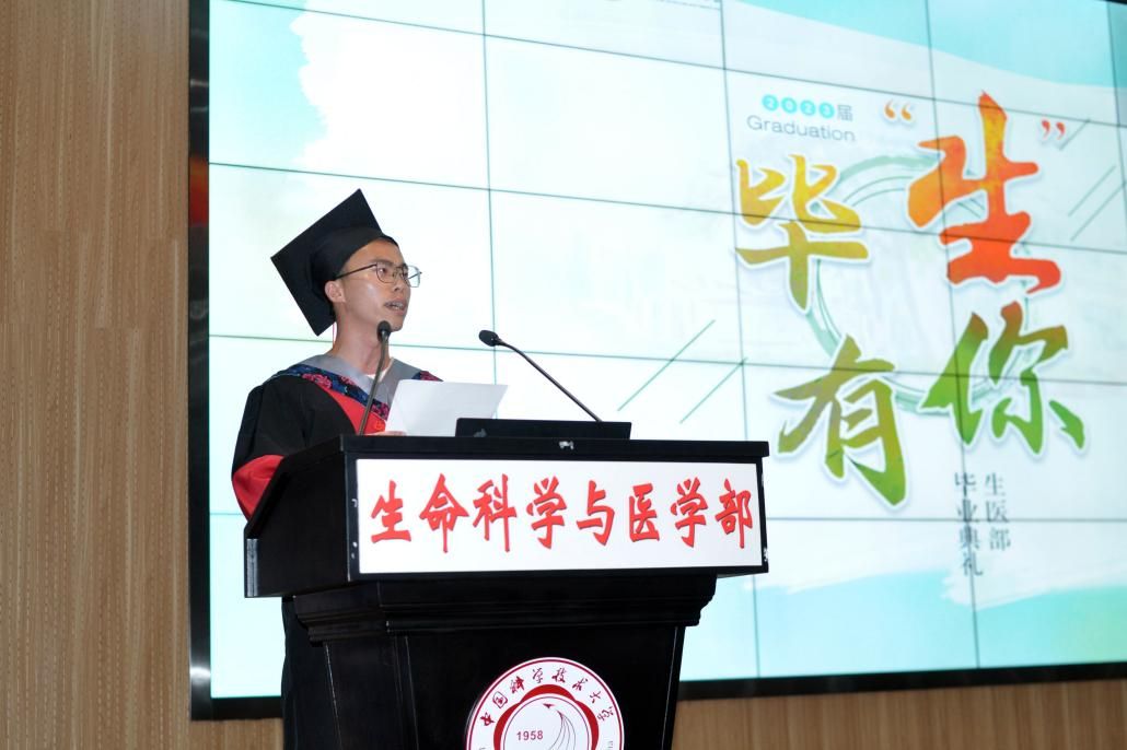 生命科学与医学部2023届毕业研究生代表侯新豪同学发言,他代表同学们感谢生医部提供的良好的科研平台,为同学们开拓视野,感谢所有的授课老师,成为同学们求学路上的榜样。他表示,未来同学们将不忘自己“科大人”的本色,牢记“红专并进,理实交融”的校训,在各自的岗位上做好本职工作,静下心来刻苦钻研、夯实科学研究基本功,勇于进行创新实践,面向世界科技前沿,面向人民生命健康,为祖国生命科学事业做出自己的贡献,实现人生的理想与价值,努力成为母校的骄傲!