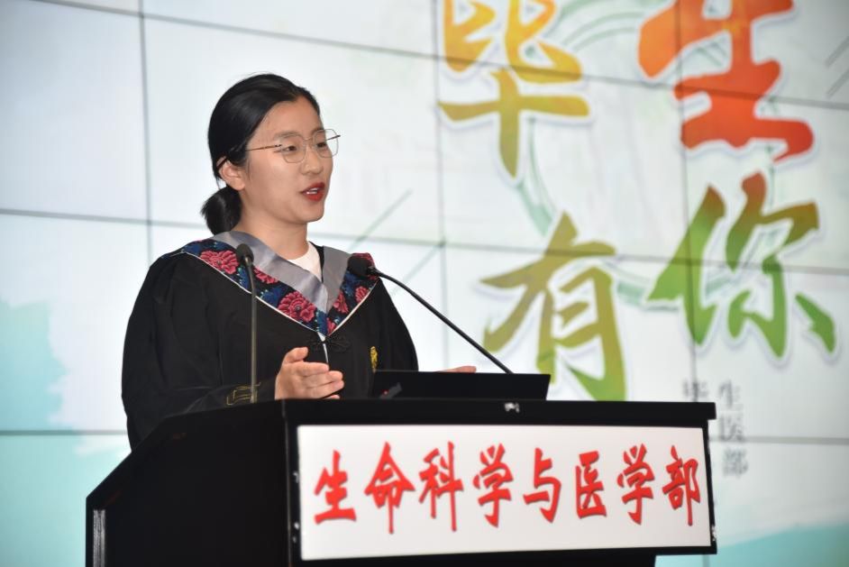 生命科学与医学部2022届本科毕业生代表刘钰莎发言,她感谢生医部的每一位老师给予同学们学习、科研、生活上的莫大帮助,得益于科大生医部的平台,同学们得以在本科阶段就进入实验室,系统地了解科研、接触科研。她表示,无论将来从事什么工作,同学们都将牢记“红专并进、理实交融”的校训,为祖国的繁荣兴盛做出自己的贡献。