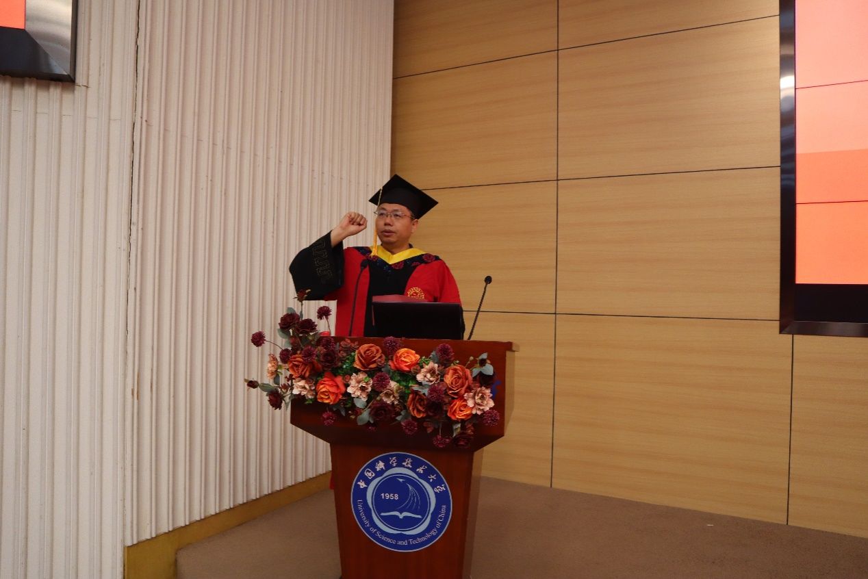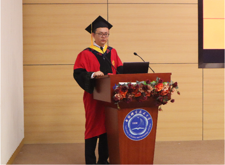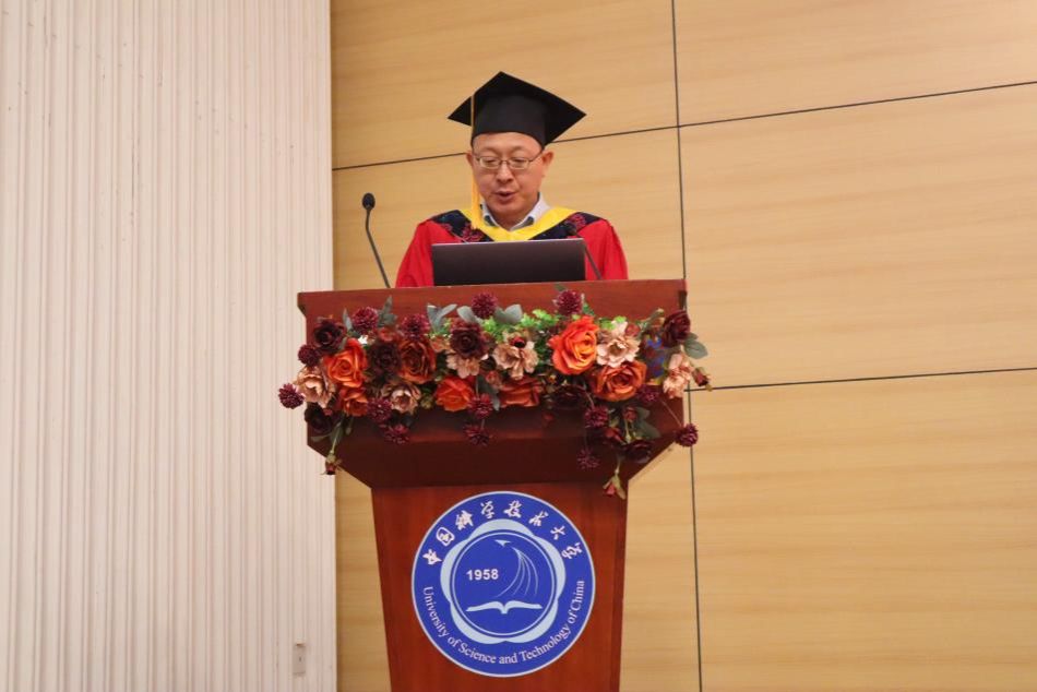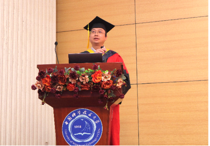 中国科大研究生院副院长姚华建教授代表研究生院向各位毕业生同学表示热烈祝贺,同时对同学们在科大求学期间的不懈努力、全方位成长和所取得的成绩表示肯定,他希望同学们能够践行科大人“科教报国、追求卓越”的铿锵视野,勇于探索,追求卓越,保持科大人的精神与秉性,永不褪色。