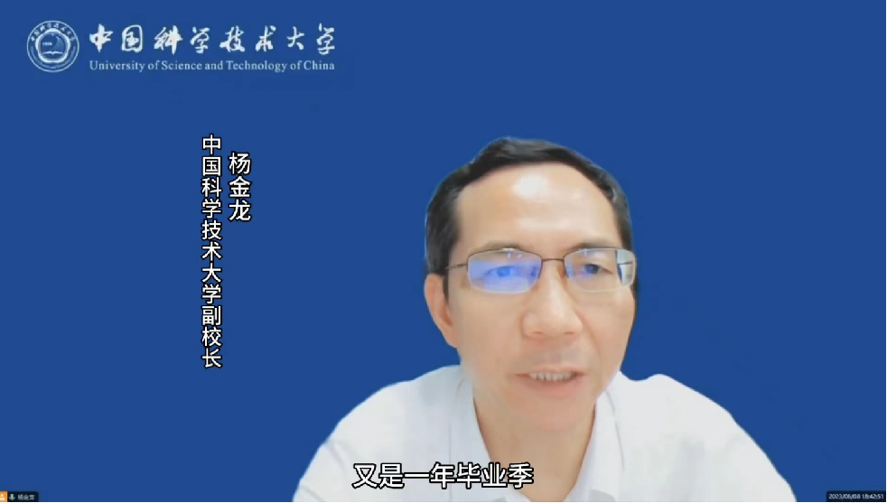 中国科大副校长杨金龙院士通过视频送来祝福。杨老师希望同学们谨记“红专并进,理实交融”的校训精神,在未来的工作中敢于担当作为,坚定理想,保持奋斗和拼搏的品质,在奋斗中提升自己的能力,实现自我价值。