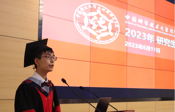 熊宇杰教授作为导师代表发言,向同学们描绘了科大化学人的“三体精准画像”,即卓越的研究能力、务实的工作态度以及开放的团队精神。最后,祝愿2023届毕业生从科大走向新岗位之后展翅高飞,不负青春。