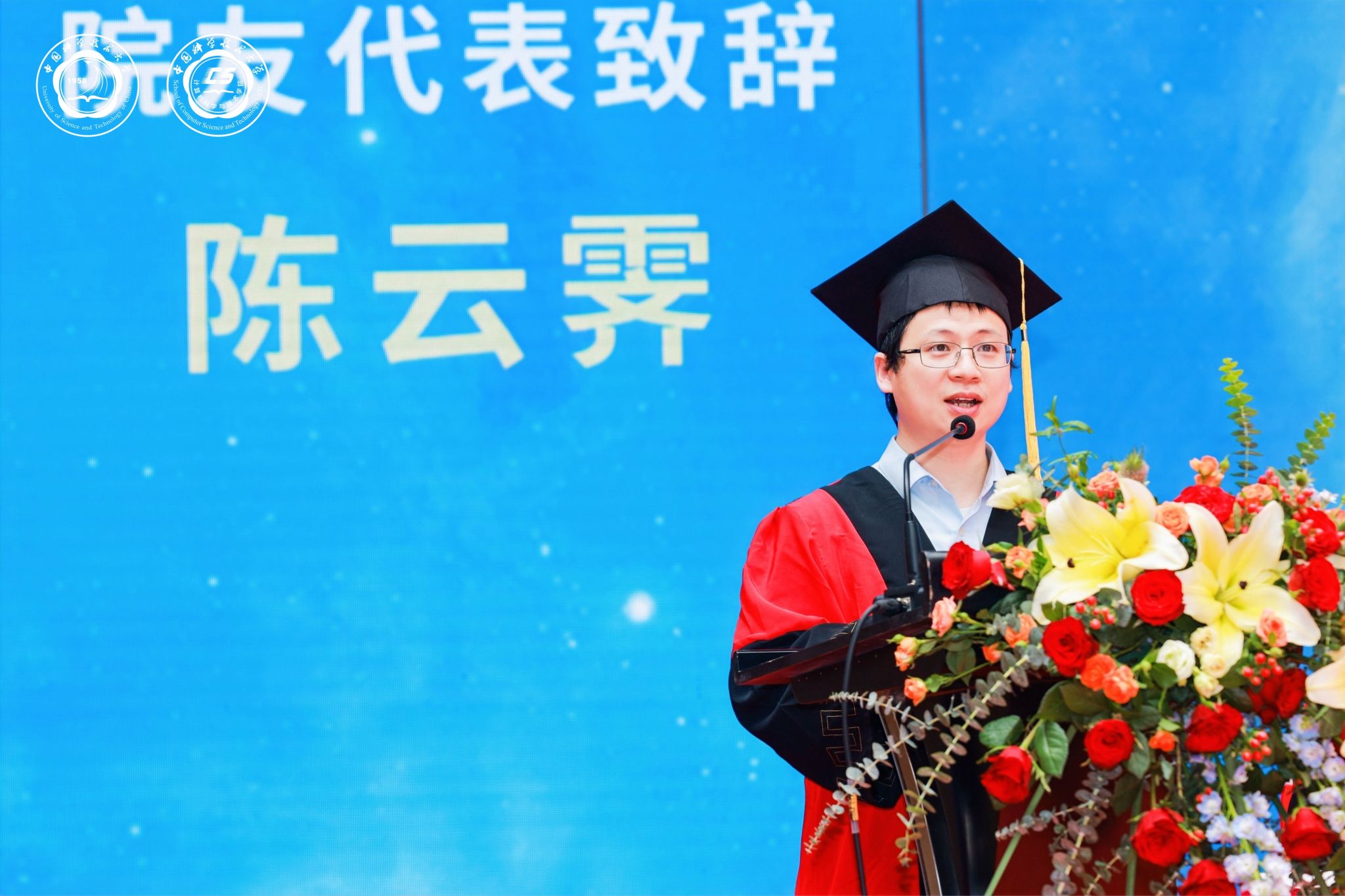 中国科学院计算研究所副所长陈云霁作为院友代表发表致辞。他以学长的身份,向毕业生们分享了宝贵的人生经验,也送出了美好的祝愿。他告诫各位同学要勇于去探索冷门、未知的领域,心怀国家与人民,敢于拼搏、永攀高峰。