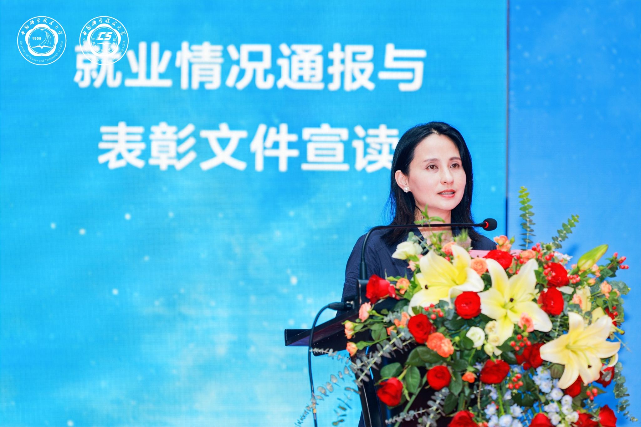 宫晓梅通报了学院近年来的就业情况并宣读2023届优秀毕业生名单,祝贺同学们以顽强的毅力、拼搏的精神克服疫情给学业带来的困难与挑战,顺利毕业;祝愿大家都能勇敢奔赴属于自己的星辰大海,做永不褪色的科大人,成为有“科气”的引领时代的奋进者和领航人。 随后,优秀毕业生们列队上场,从主席台各位老师手中接过奖状,并合影留念。