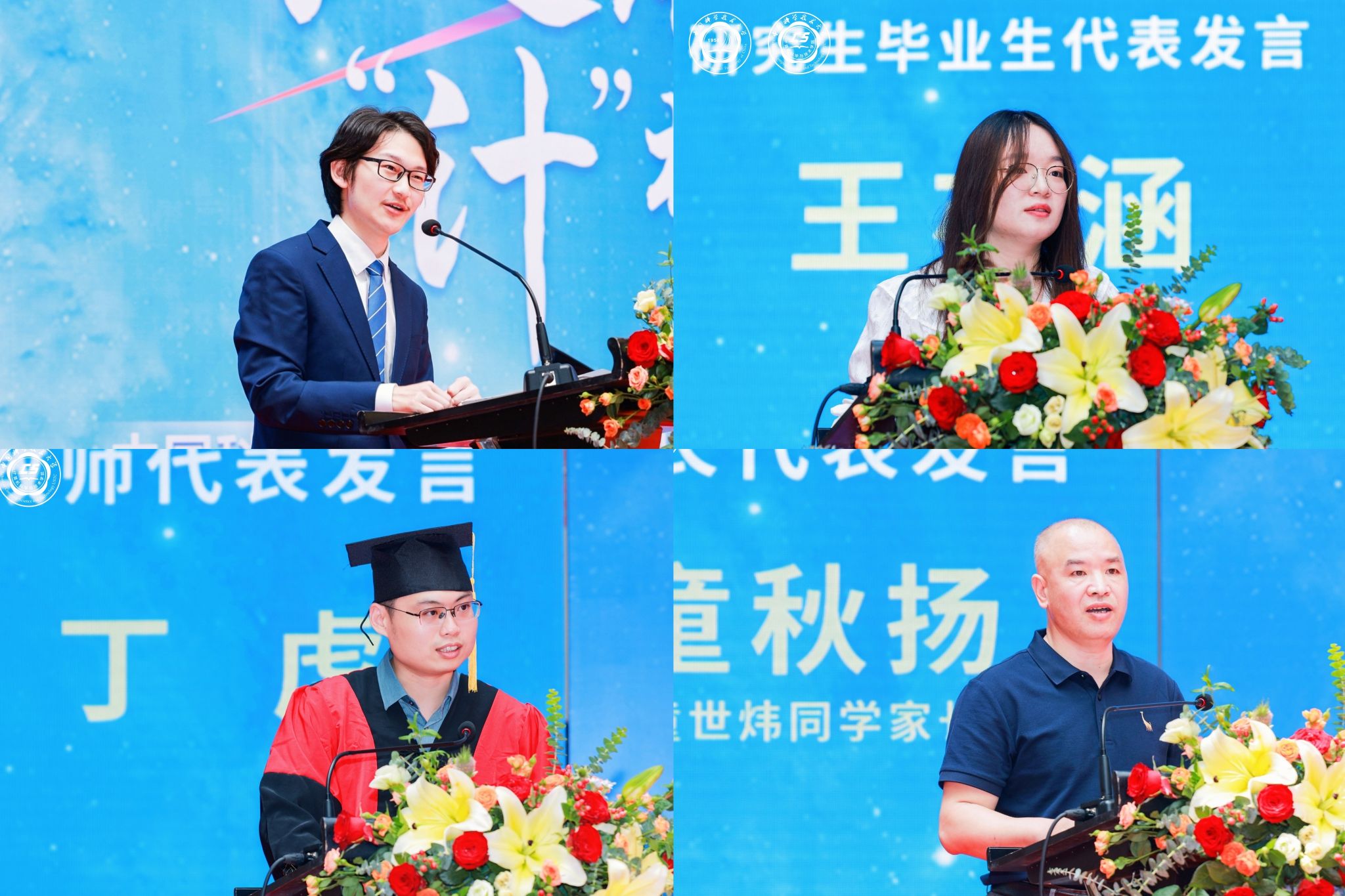 本科生代表彭浩然向大家展现了计算机语言的魅力,希望用自己所学发展科技、造福社会,联结世界。研究生代表王亦涵感谢了母校与恩师多年来的悉心栽培,也鼓励了同学们无论遇到什么风雨,都要坚持自己的热爱。2020级学术博士毕业生童世炜同学的父亲童秋扬代表全体毕业生家长感谢了每位老师的辛勤耕耘与无私奉献,向即将走向人生新阶段的同学们表达了真切的祝福。教师代表丁虎引经据典,用生动的例子告诫同学们不管处于什么境遇,面对何种问题,都要自信而从容,洒脱而坚定。