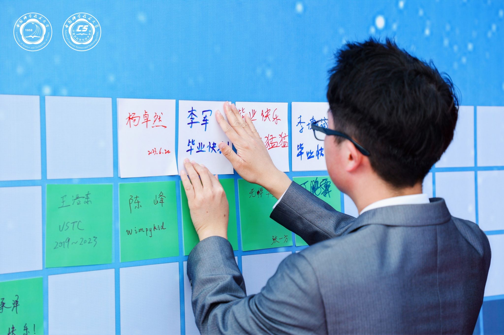 上午8:15,红毯仪式在万众瞩目之下开启。毕业生们将写满毕业感言的卡片,郑重地贴在签到墙上,拼贴出“USTC-CS”的字样,是学院见证了他们精彩的青春。大屏上播放着来自恩师的寄语与同窗的祝福,将人们拉回青涩的校园时光。毕业生们或与恩师同行,或与同窗相伴,或与亲友共庆,脸上洋溢着自豪和喜悦的笑容,享受独属于他们的高光瞬间。