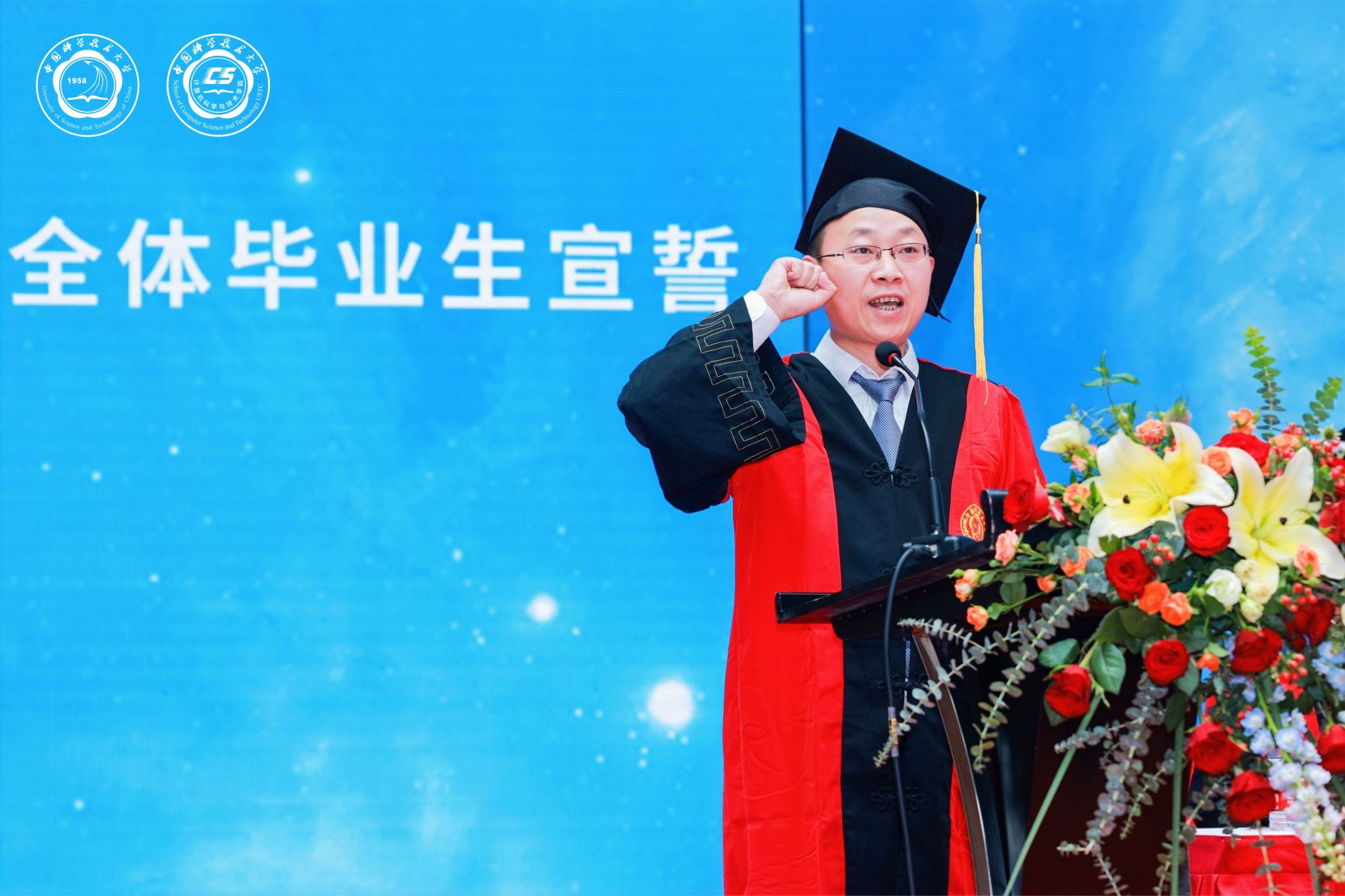 党委书记兼副院长徐宏力带领全体毕业生庄严宣誓:“不负父母的期盼,不负恩师的厚望,不忘母校的培养;我们坚守母校信念,热爱科学、崇尚真理;我们传承母校精神,科教报国、追求卓越。我们用才华和智慧肩负起民族复兴的使命;用青春和热血承担起国家富强的责任。一生忠诚于祖国和人民,争做中华民族的栋梁;用成就和硕果回报母校与学院。”