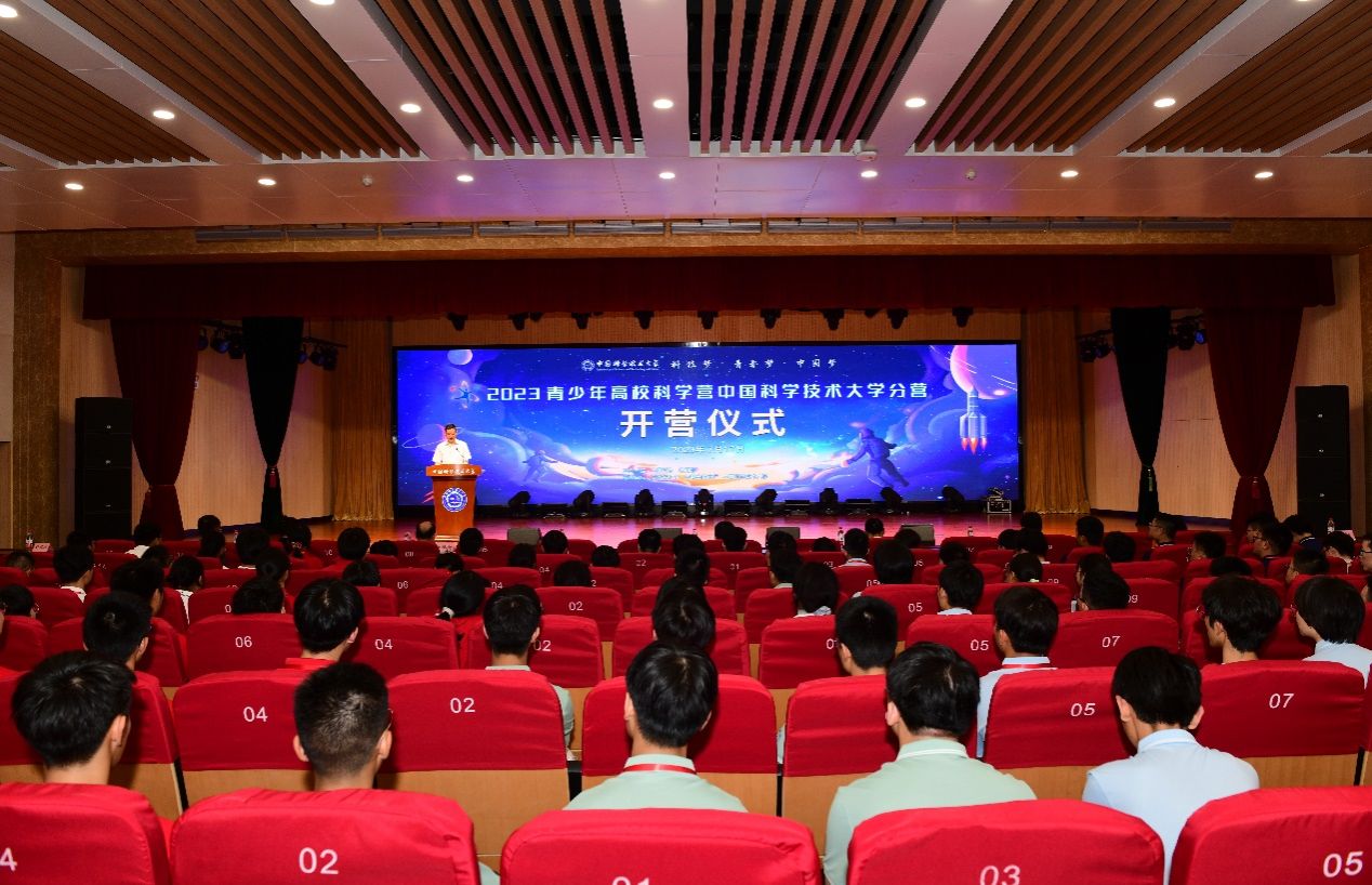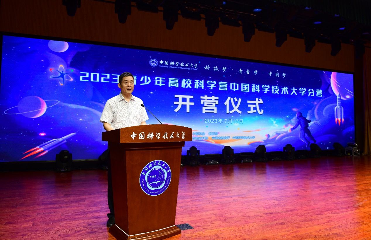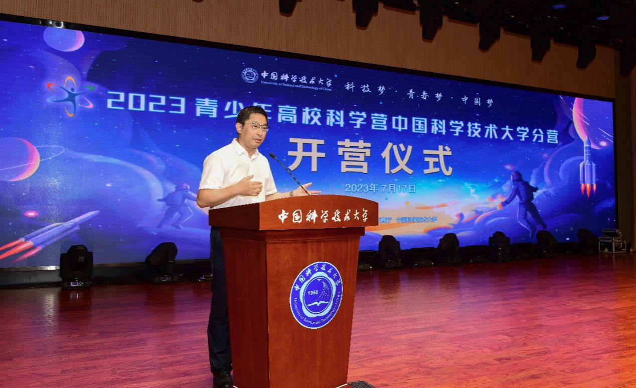 7月17日上午,2023年青少年高校科学营中国科学技术大学分营开营仪式在西区活动中心举行。来自安徽省广德市、马鞍山市、安庆市、滁州市等地的100名学生和10名带队老师齐聚中国科大,开启为期7天的科学体验之旅。校党委常委、副校长周丛照出席并致欢迎词,安徽省科协副主席刘旭、安徽省教育厅二级巡视员郑德新、校团委书记杨晓果、教务处副处长吴强、安徽省科技活动中心主任汪晓东等出席开营仪式。