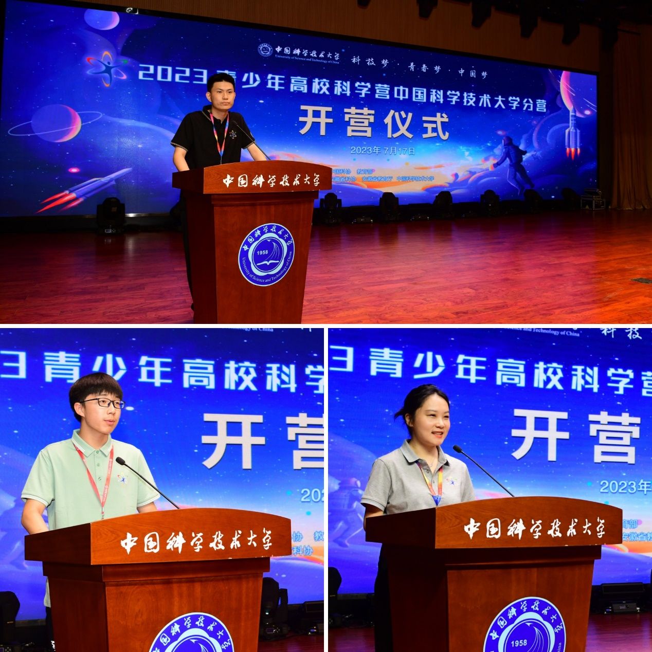 广德中学带队老师李润秋代表全体带队老师、滁州中学姜李想同学代表全体营员发言,表达了对活动主办和承办方的感谢,以及对接下来一周科学营生活的期待。志愿者代表黄聪聪代表全体科学营志愿者表示,会用满腔热忱助力营员们在中国科大度过充实难忘的科学营活动,用科技梦托起青春梦,共筑中国梦。
