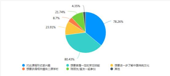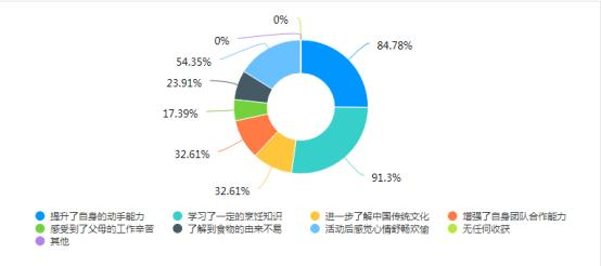 在实践课堂课后反馈问卷统计结果中显示,超过80%的同学是第一次参加课程,最吸引同学们来参加课程的原因是:对此活动形式感兴趣、想要掌握一定的烹饪技能、想要进一步了解中国传统文化。同学们参加课程的主要收获是学习了一定的烹饪知识、提升了自身的动手能力、活动后感觉心情舒畅欢愉、进一步了解中国传统文化、增强了自身团队合作能力。有超过97%的同学表示会再次参加此课程或将此课程推荐给其他同学。