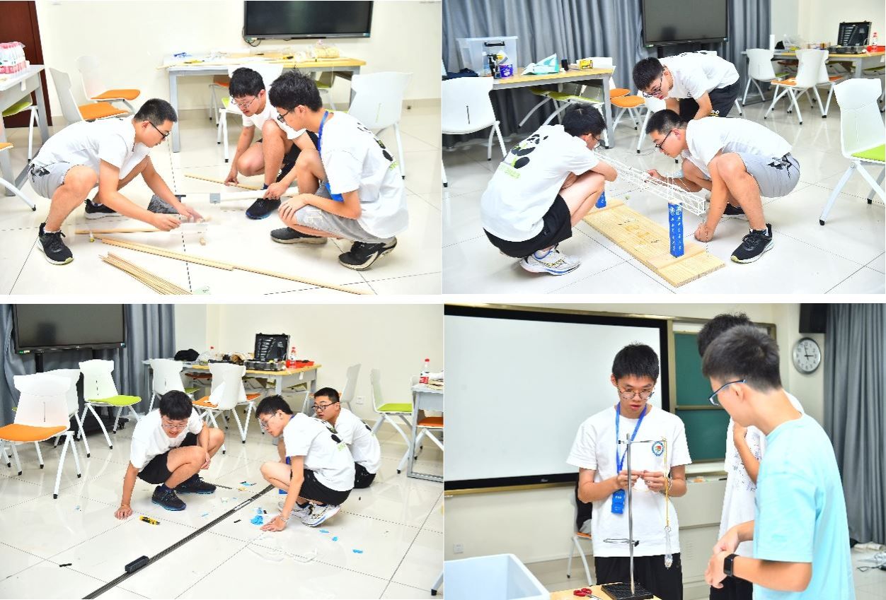 “理论设计与操作”团体赛的赛制采用4轮积分赛的形式,每轮比赛由三名队员合作,针对给定问题进行理论分析、力学设计并最终动手操作完成实验比赛。经过全国各高校个人赛成绩层层选拔和按地区原则遴选,有中国科学技术大学、哈尔滨工业大学、上海交通大学、北京大学、清华大学等46支高校代表队参加了本届团体赛的比赛。