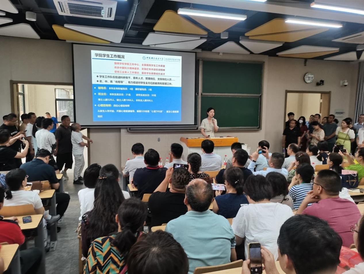 董新美介绍了学院的学生工作情况,包括“三全育人”工作理念、学工队伍概况、工作做法及实践等。同时,还为家长们讲述了学院本科生的培养路径,如英才班的拔尖人才培养、与微软亚洲研究院合作的教育部新模式人才培养等,此外,她还就学院的奖助补勤体系、学业帮扶机制、就业前景、校友资源等向家长们作了一一介绍。学在科大,悦享科大。董新美邀请新生家长们携手启航,与孩子一起度过大一的适应阶段,在独立成长、人际交往、规律作息、身体锻炼等方面多多给予鼓励和支持,助力孩子走好新阶段的求学之路。