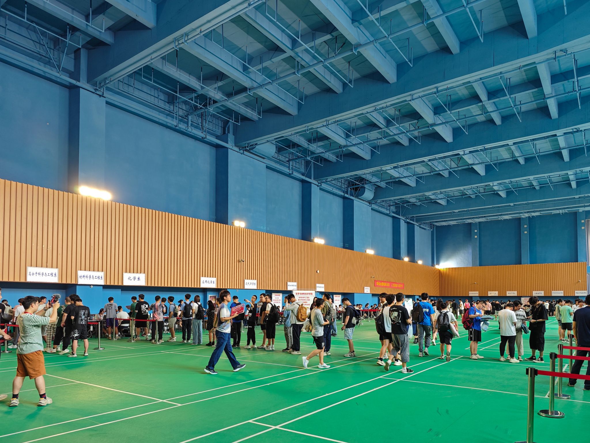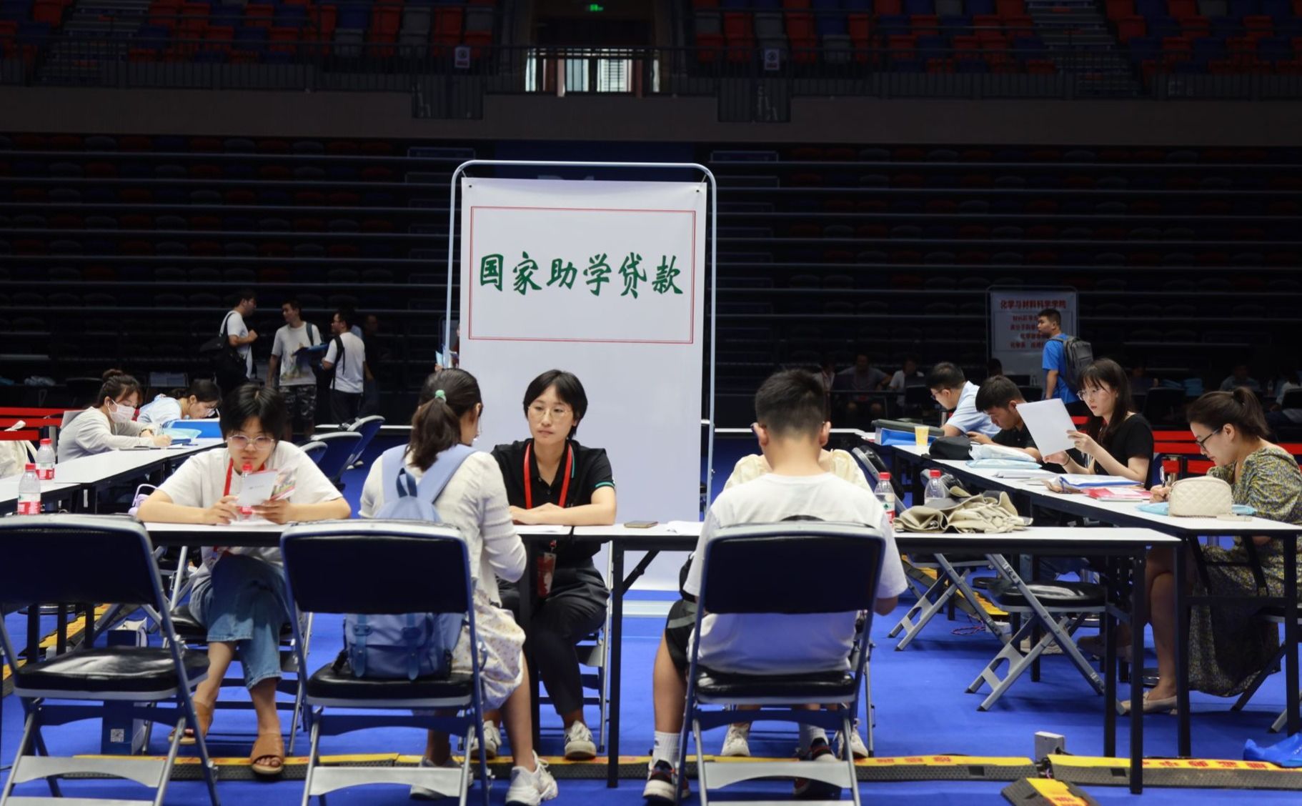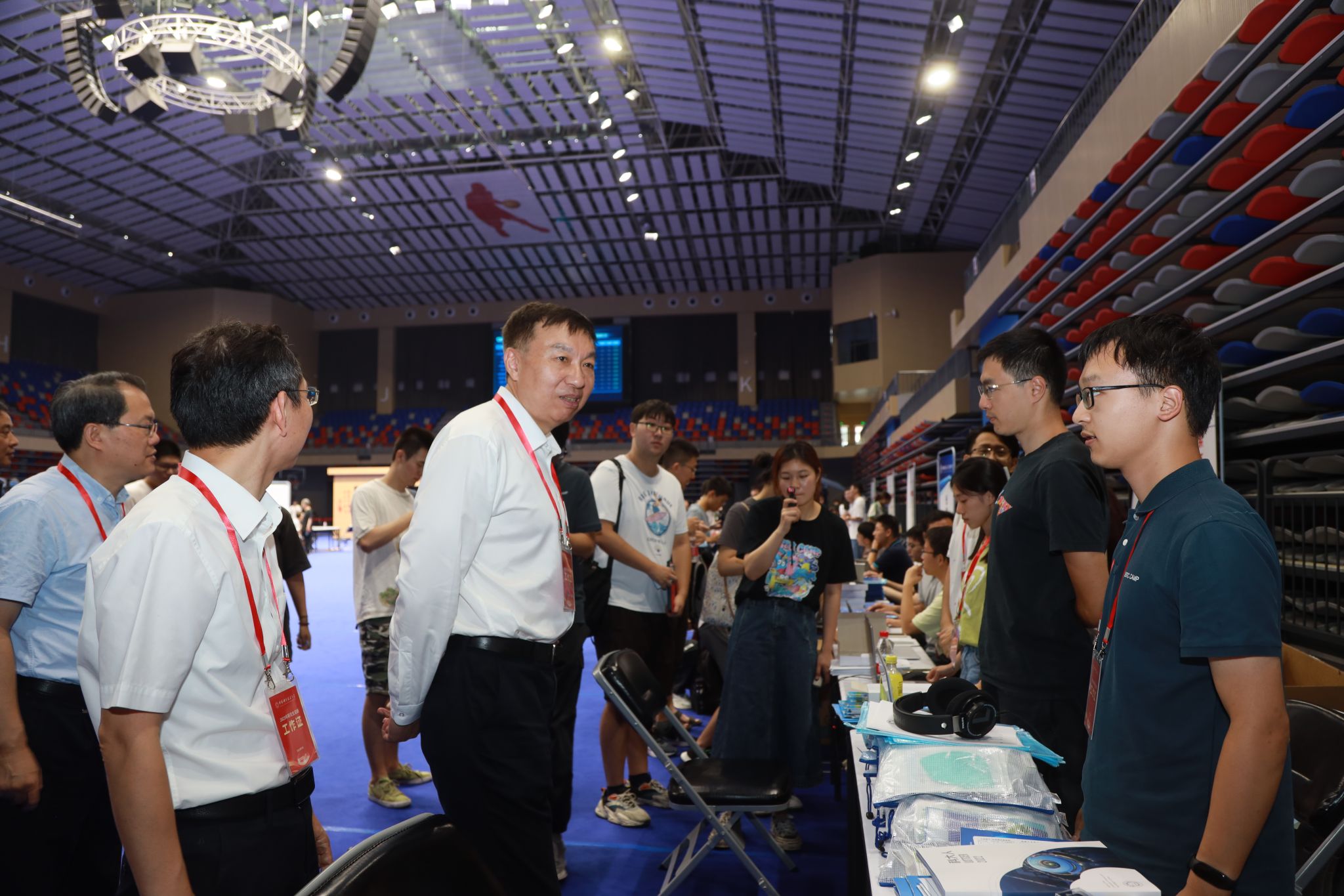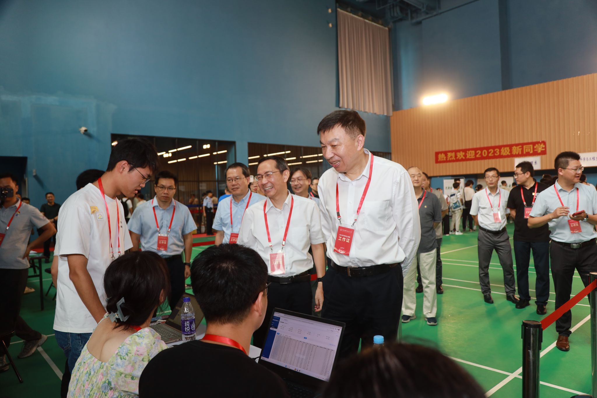 随后,舒歌群一行来到中校区体育馆调研学生报到迎新情况。体育馆两边的大屏幕上,实时播放着现场报到数据。舒歌群详细询问各学院招录计划、已报到人数与比例、生源地、学籍管理、迎新特色活动等情况,并对迎新志愿者们的辛勤付出表示感谢,对学校相关单位和部门间的通力合作和细致服务表示肯定。