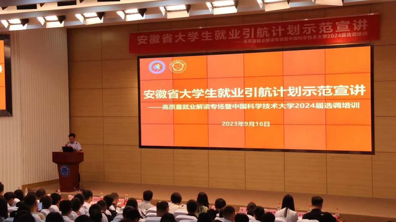 9月16日上午,安徽省大学生就业引航计划示范宣讲——高质量就业解读专场暨中国科学技术大学2024届选调培训在东校区理化大楼东三报告厅隆重举行。团安徽省委学校部部长邹永生,安徽省学联驻会主席徐迎归、恽郑曦,校党委组织部常务副部长申成龙,校团委书记杨晓果,招生就业处选调生项目负责人于萌,部分在肥兄弟高校团委负责同志等出席本次活动,500余名学生参与学习。本次活动由校团委副书记林高华主持。