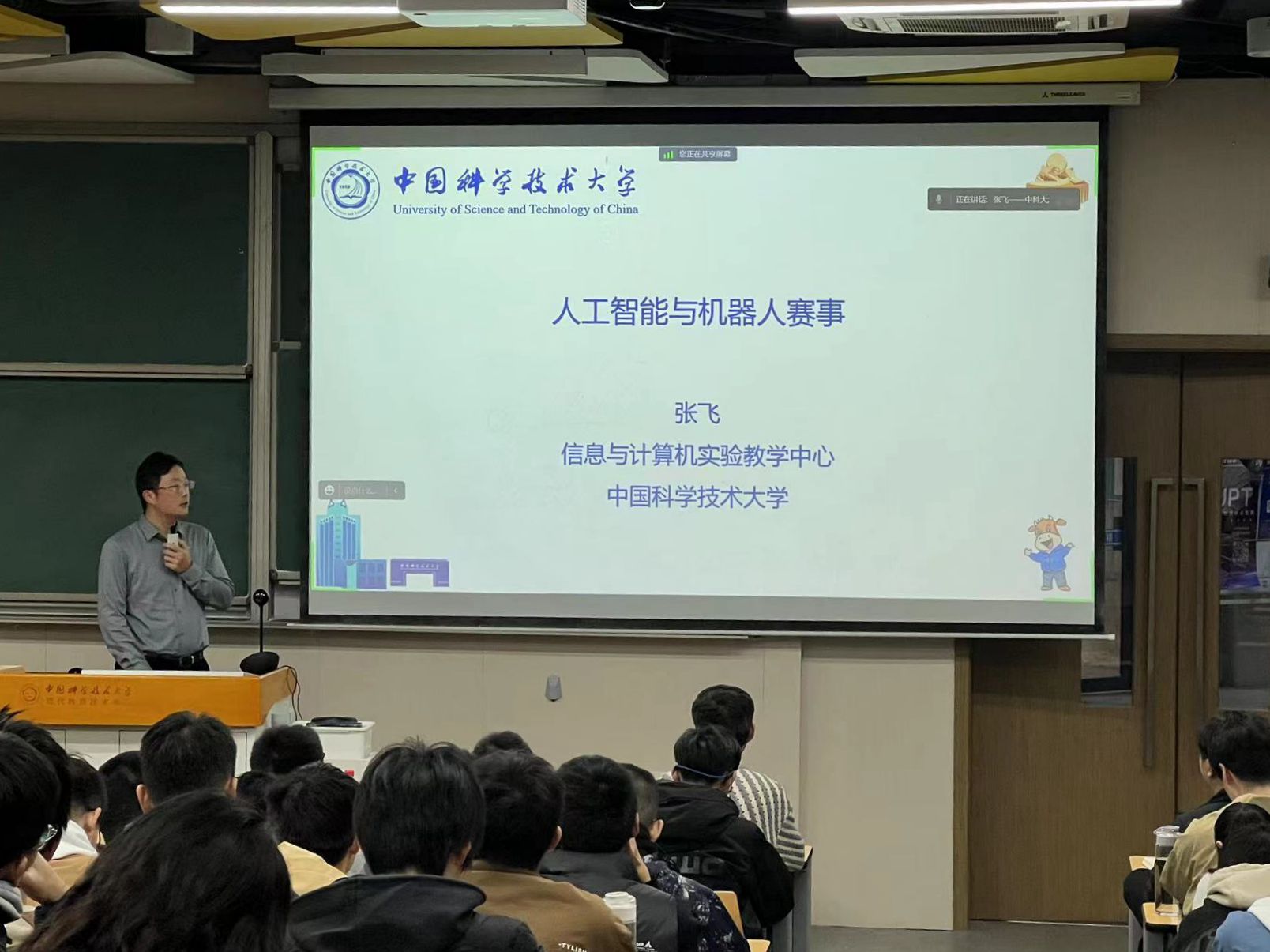 接着,张飞博士介绍了人工智能实训平台和人工智能创新应用大赛。张飞博士用视频及图片形象地展示了机器人和人工智能平台的应用,也展示了与机器人相关的学科竞赛及大创项目成果,激发了同学们的兴趣。最后张飞博士分享了如何在实践活动中脱颖而出的经验,并鼓励同学们多多跨专业交流。