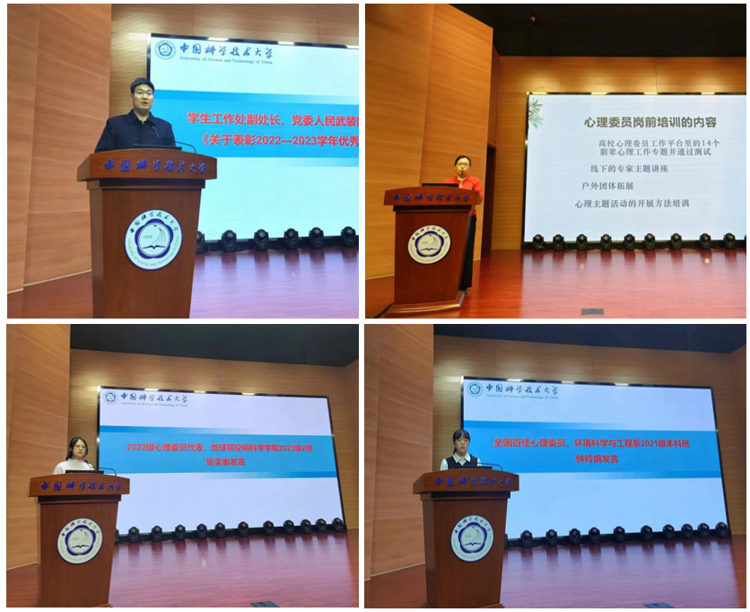 开班仪式上,刘伟丰宣读《关于表彰2022-2023学年优秀心理委员的决定》;心理健康教育与咨询中心专职教师崔静琳介绍心理委员培训学习安排;地球与空间科学学院2023级2班张奕衡代表新生心理委员发言;第六届全国百佳心理委员、环境科学与工程系2021级本科班钟玲娟分享心理委员工作经验。
