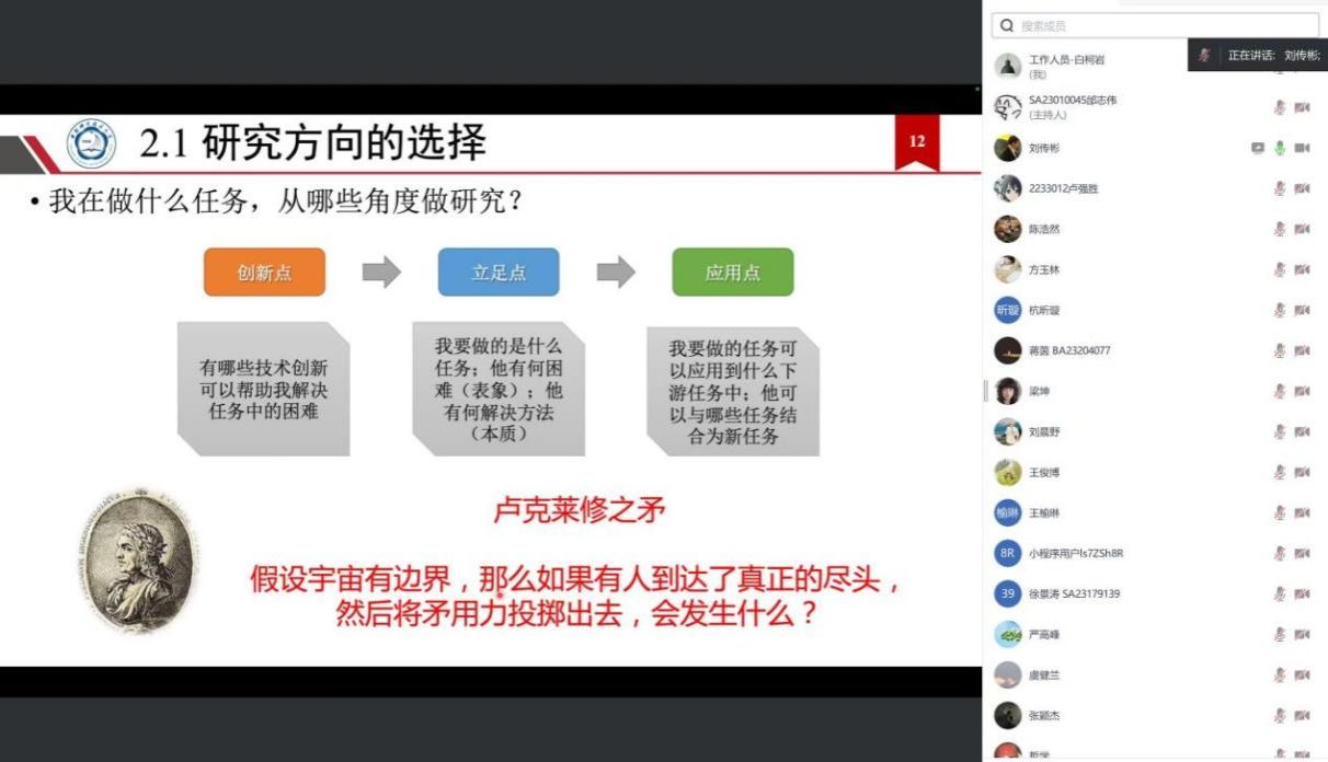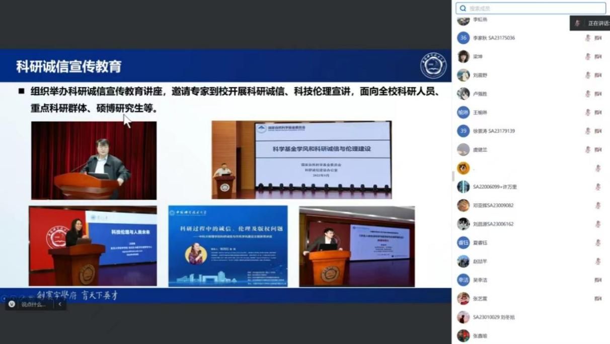 12月3日晚19:30 ,“研而有信”2023科研启航系列活动之科研思维与方法分享暨科研诚信讲座在腾讯会议平台线上举行。本次讲座邀请了信息科学技术学院青年教师刘传彬、科研部学风与科研诚信建设办公室主管赵军分别针对科研思维与方法、科研诚信等为同学们作经验分享和政策规范介绍。