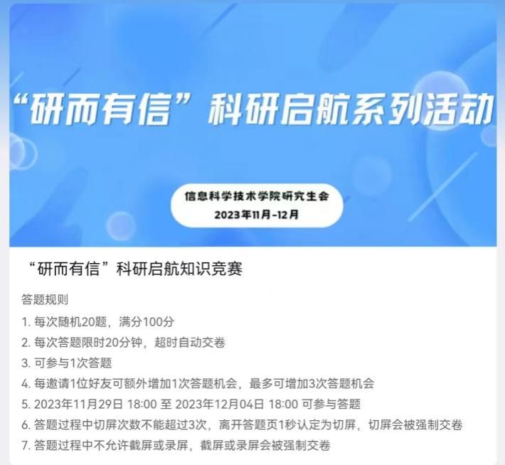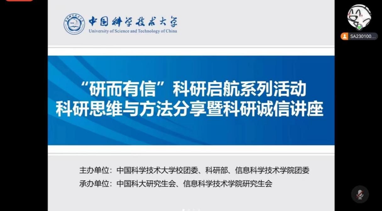 为进一步加强全校同学间的学术交流,提升研究生科研能力及科研诚信意识,规范论文发表和科研成果管理,深入推进科研诚信及学风建设,全面提升科研素养与能力。由中国科学技术大学团委、科研部、信息科学技术学院团委主办、中国科学技术大学研究生会、信息科学技术学院研究生会承办的“研而有信”2023科研启航系列活动自11月29日拉开帷幕,于12月4日圆满落幕。