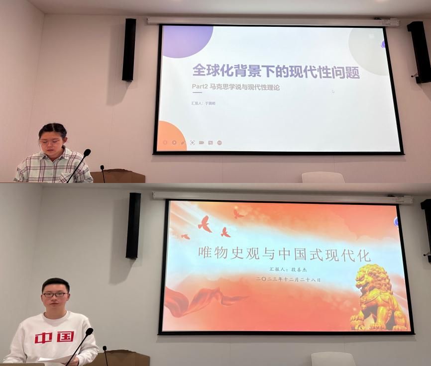 于翼萌基于《全球化背景下的现代性问题》中马克思学说与现代性社会理论部分作了学习汇报,关注《论马克思现代性的双重批判》《资本与现代性——马克思的回答》等五篇论文中关于马克思学说批判性、实践性等方面的观点,探讨如何以现代性批判为视角重构马克思思想阐释。段善杰分享了刘同舫《唯物史观与中国式现代化》一书中“唯物史观视域中的中国式现代化”相关内容。他从政治经济学、哲学和科学社会主义三个方面梳理唯物史观的基本观点,全面阐释历史之变和时代之变中中国式现代化的理论创新,呈现出中国式现代化唯物史观的价值意蕴。