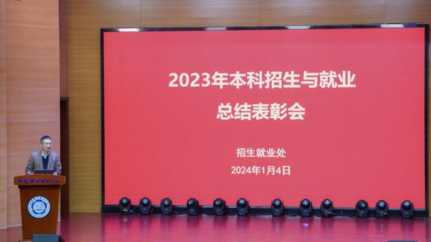 1月4日下午,学校2023年本科招生与就业总结表彰会在东校区水上报告厅召开。党委常委、副校长周丛照出席会议并讲话,各学院和重点科研机构本科招生、就业工作负责人、获表彰集体、个人代表参加了会议。会议由招生就业处处长武晓君主持。