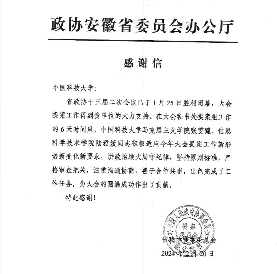 近日,安徽省政协提案委员会给我校发来感谢信,对马克思主义学院张雯霆同志和信息科学技术学院陆雅媛同志在安徽省政协十三届二次会议期间,积极适应大会提案工作新形势新变化新要求、出色完成相关工作任务表示感谢。