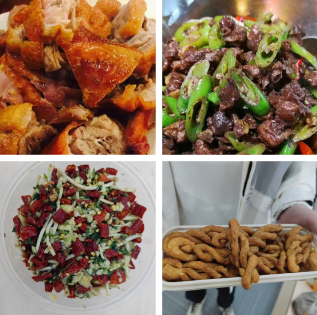 青岛酿皮、湖南永州鸭血、海南红糖年糕、贵州凉拌折耳根、广东潮汕牛肉丸……随后,大家纷纷拿出自己精心准备的美食,展示给全班同学。作为安徽东道主,曾皓、桂运安分别给大家带来了庐州烤鸭和蒿子粑粑,香气四溢的美食让大家垂涎欲滴。来自新疆的同学给大家带来了羊肉串和芝麻馕,同样香气扑鼻,让人回味无穷。此外,还有蒙古奶茶、河南信阳毛尖、江西修水菊花茶等传统饮品,甜醅子、桂花酥、千层饼等甜点小吃,以及锥栗等各地特产。同学们在品尝美食的同时,也聆听了美食背后的故事,感受了各地的风土人情和独特魅力。
