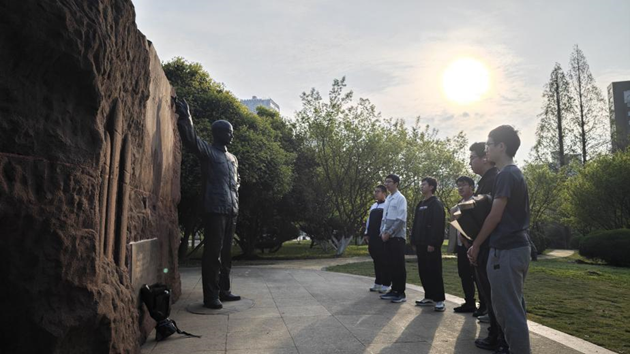 同学们继续晨跑,沿寰宇东路来到钱学森先生塑像前,向钱学森先生的塑像献花,肃立缅怀,鞠躬致敬。钱学森先生是享誉海内外的国家杰出贡献科学家和中国航天事业的奠基人。钱学森1955年归国后,立即投身国家的国防科学事业,主持完成了“喷气和火箭技术的建立”规划,参与了近程导弹、中近程导弹和中国第一颗人造地球卫星的研制,直接领导了用中近程导弹运载原子弹“两弹结合”试验。钱老是我校的主要创始人之一,钱学森与郭永怀等筹建了中国科学技术大学力学和力学工程系;中国科学技术大学创建时,钱学森与郭永怀领导了化学物理系的创建工作。创建过程中,钱学森连教研室主任、主要任课教师等都亲手聘任,还为力学系招生撰写介绍文章《力学的现状及其发展方向》,并参与讨论课程体系与教学计划等。钱老曾告诫学生,科学上不能有一点失误,小数点错一个,打出去的导弹就可能飞回来打到自己。钱老“严谨、严肃、严格、严密”的学术精神始终激励着同学们。