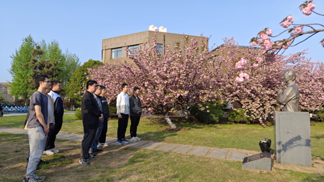 最后,同学们来到夏培肃先生雕塑前,献花,肃立缅怀,鞠躬致敬。夏培肃先生是著名计算机专家和教育家、我国计算机研究的先驱和我国计算机事业的重要奠基人之一、中国科学院计算技术研究所研究员、中国科学院院士。1960年,夏培肃先生设计试制成功中国第一台自行设计的电子计算机——107计算机(科大一号)。从20世纪60年代初期开始,夏培肃先生一直研究如何提高计算机的运算速度,探索实现高性能计算机的技术,并负责研制成功多台高性能计算机。夏先生的一生始终围绕计算机,晚年时对学生最多的叮嘱就是:“我这辈子最大的心愿是搞好中国的计算机事业,我们这代人没搞好,你要搞得比我好。”“以后我们回来建设新中国。”她为表明“中国人有能力、有志气设计和研制自己的计算机”,勇闯科研难关;她一生甘为“人梯”,后人评价说:她为计算机事业培养学生的影响,远远超过研制“107机”。清明时节,计算机学院的同学们缅怀夏先生,也接续着夏先生等一代代中国计算机人的伟业,迎着晨光,奔跑前进。