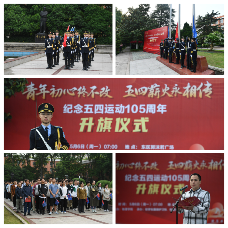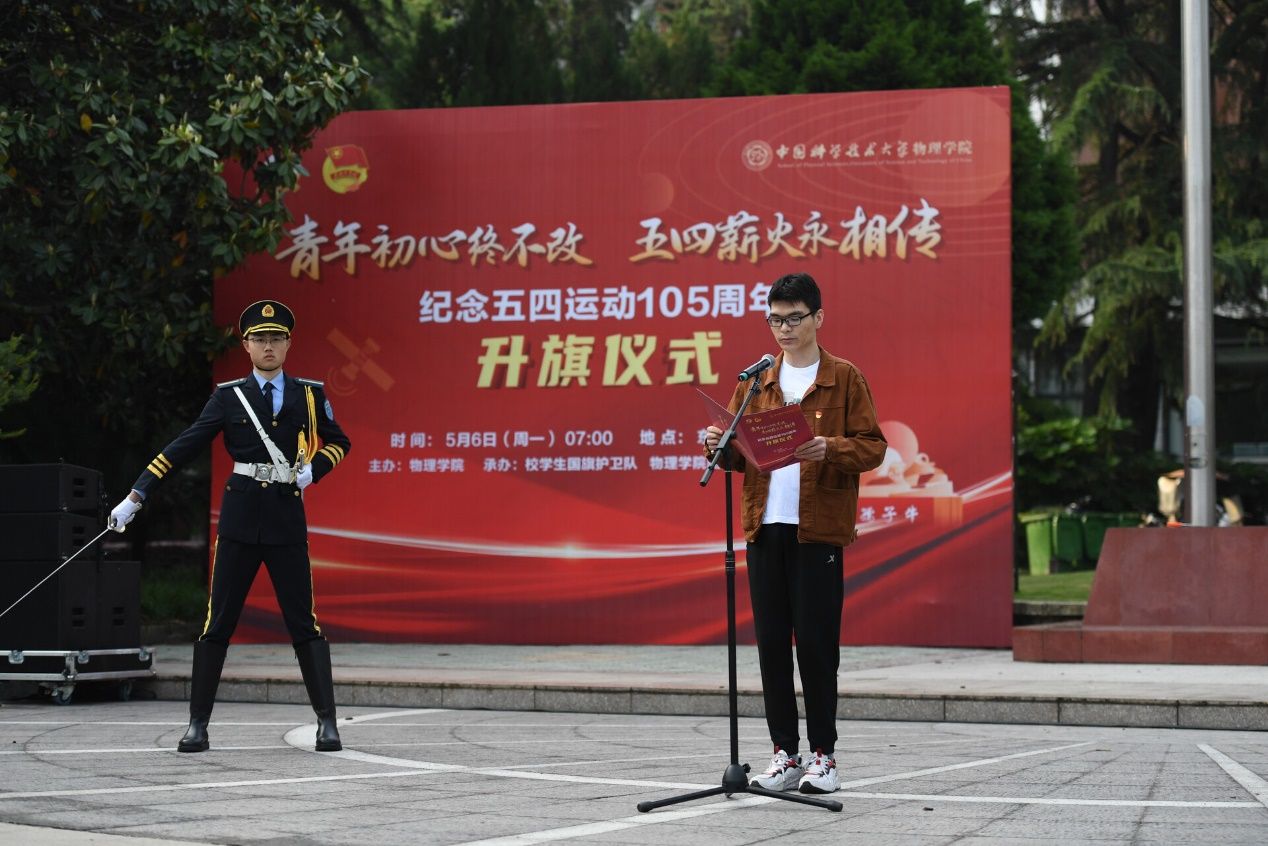 为进一步学习传承五四精神,弘扬“红专并进,理实交融”的校训精神,2024年5月6日清晨,物理学院在东区郭沫若广场举行“青年初心终不改,五四薪火永相传”暨纪念五四运动105周年升旗仪式。校团委副书记、物理学院青年教师代表李海欧,物理学院党委副书记凌锋,物理学院本科生物理学专业 和应用物理学专业两个党支部全体成员、发展对象、入党积极分子和自发前来观礼的广大师生校友参加仪式。仪式由物理学院物理学专业本科生党支部预备党员胡子谦主持。