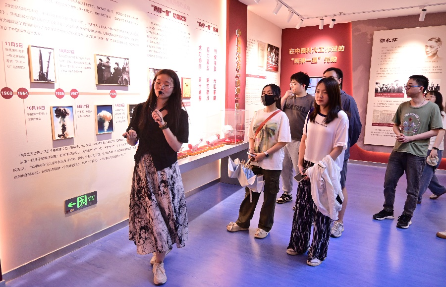 参观过程中,随着讲解员的娓娓道来,同学们的思绪纷纷进入了那段波澜壮阔的科技攻关史。为守山河无恙,为保祖国安康,钱学森、邓稼先、于敏等一批批怀揣报国之志的青年才俊,汇聚于金银滩,艰苦奋斗、矢志求索,以“干惊天动地事,做隐姓埋名人”的使命担当,推动着“两弹一星”事业不断前进。经过多年奋斗,1964年,中国第一颗原子弹爆炸成功;1966年,原子弹和导弹结合飞行成功;1970年,中国第一颗卫星发射成功。这些举世瞩目的辉煌成就的背后,是中国老一辈科学家用青春、智慧、家国情怀谱写的自立自强的赞歌,更是他们用生命和鲜血铸就的“两弹一星”精神。