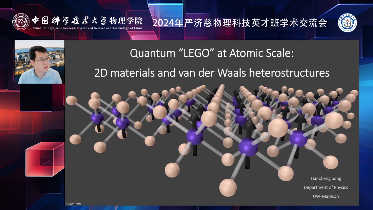 特邀嘉宾2012级严班学长宋天城(现任美国威斯康星-麦迪逊大学助理教授)作题为Quantum "LEGO" at Atomic Scale: 2D Materials and van der Waals Heterostructures的报告,详细介绍了二维材料的制备以及挑战,并结合van der Waals fabrications以及光谱学和显微成像对研究前沿进行介绍。他分享了自己科研学习中的成长经历,鼓励学弟学妹们要保持对学习的热情,不断拓宽视野,找到自己感兴趣的方向并为之努力。